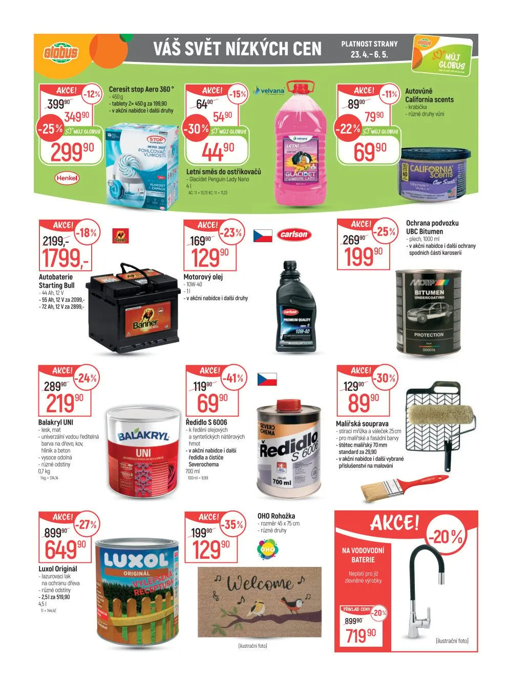Mezi hlavními položkami najdete autobaterie Starting Bull za 1 799 Kč a vodou ředitelnou barvu Balakryl Uni v lesku i matu za 21 990 Kč. Dále je v akci Lazurovací lak Luxol Originál za 64 990 Kč a motorový olej za 12 990 Kč.