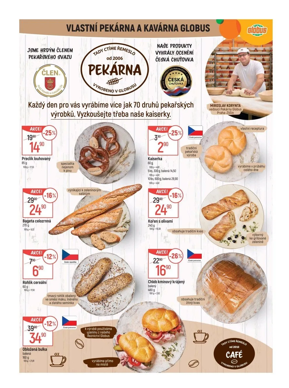 V letáku obchodu Globus najdete širokou nabídku pekařských výrobků, které jsou vyráběny s láskou a péčí. Naše pekárna, hrdý člen pekařského svazu od roku 2006, nabízí více než 70 druhů čerstvého pečiva každý den.