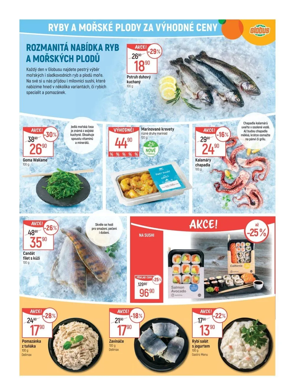 V letáku obchodu Globus najdete širokou nabídku ryb a mořských plodů za výhodné ceny. Každý den si můžete vybrat z pestrého sortimentu mořských i sladkovodních ryb. Pro milovníky sushi máme několik variant, včetně rybích specialit a pomazánek.