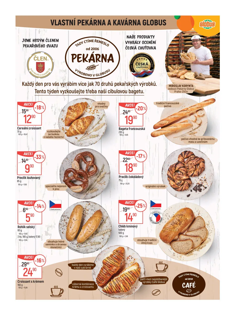 V letáku obchodu Globus najdete širokou nabídku čerstvých pekařských výrobků, které každý den vyrábíme s láskou a péčí. Tento týden doporučujeme vyzkoušet naši cibulovou bagetu, která je skvělou volbou pro každého milovníka pečiva.