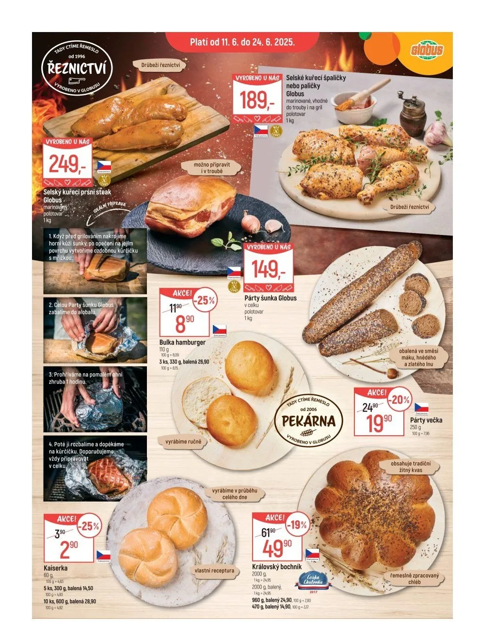 V letáku obchodu Globus najdete skvělé akce na čerstvé produkty, které potěší každého milovníka dobrého jídla. Od 11.6. do 24.6.2025 si můžete zakoupit selské kuřecí prsní steaky za 249,- Kč za kilogram. Tyto steaky jsou ideální pro přípravu na grilu nebo v troubě, kde vytvoříte chutnou kůrčičku.