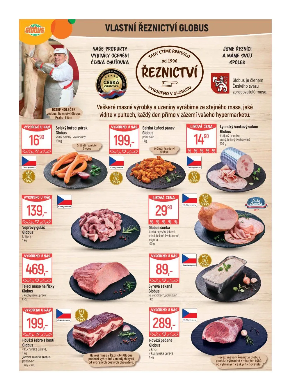 V našem řeznictví Globus ctíme tradiční řemeslo a nabízíme široký výběr kvalitních masných výrobků a uzenin. Od roku 1996 jsme hrdými členy Českého svazu zpracovatelů masa. Naše produkty, jako je vepřový guláš, telecí maso na řízky nebo hovězí žebro s kostí, jsou vyráběny přímo v zázemí hypermarketu z masa, které vidíte na pultech.
