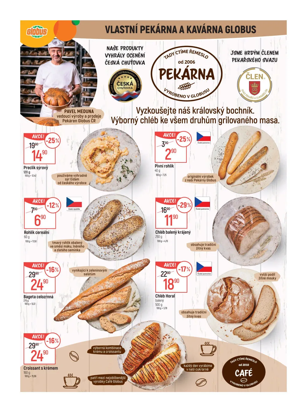V obchodu Globus najdete širokou nabídku kvalitních pekárenských a cukrářských výrobků. Naše vlastní pekárna a kavárna se pyšní oceněními za vynikající chuť a kvalitu. Vyzkoušejte náš královský bochník, ideální k grilovanému masu, nebo lahodný preclík se sýrem.