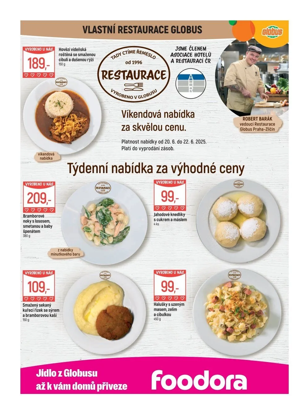 V letáku obchodu Globus najdete skvělou víkendovou nabídku, která potěší vaše chuťové pohárky. Mezi lákavými pokrmy se objevují bramborové noky s lososem, smetanou a baby špenátem za 209 Kč, nebo hovězí vídeňská roštěná se smaženou cibulí a dušenou rýží za 199 Kč.