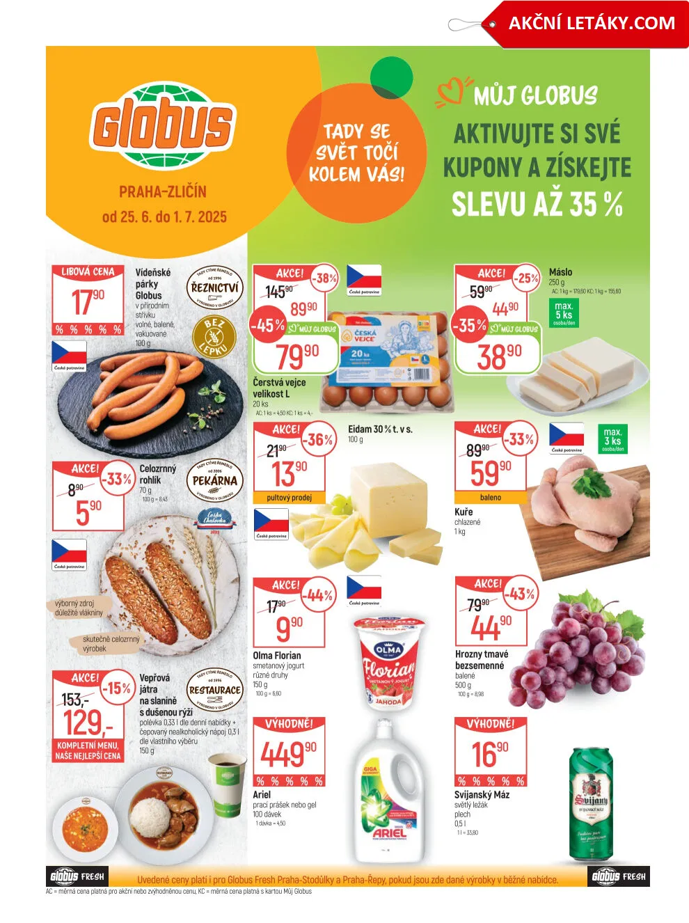 V letáku obchodu Globus najdete skvělé akční nabídky od 25.6. do 1.7.2025. Můžete si aktivovat kupony a získat slevu až 35 %. Mezi lákavé produkty patří vídeňské párky, čerstvá vejce velikosti L a smetana Olma Florian. Dále si můžete pořídit prací prášek nebo gel Ariel, chlazené kuře a bezsemenné tmavé hrozny. Nezapomeňte také na Svijanský máz a máslo v akci. V nabídce je i vepřová játra a kompletní menu v restauraci za nejlepší cenu. Navštivte nás a využijte výhodné nabídky!