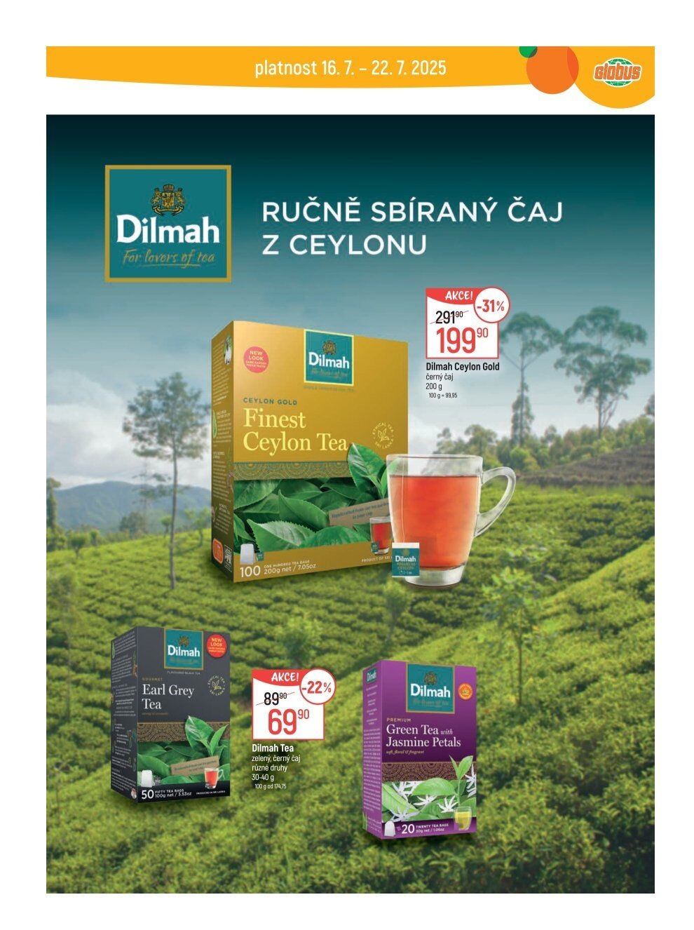 V letáku obchodu Globus najdete skvělou nabídku ručně sbíraného čaje Dilmah z Ceylonu. Mezi produkty se nachází černý čaj Dilmah Ceylon Gold, který je vysoce kvalitní a ideální pro milovníky silného čaje. Dále si můžete vychutnat zelený čaj s jasmínovými okvětními lístky, který přináší osvěžující chuť a aroma. Všechny čaje jsou dostupné v různých variantách a baleních o hmotnosti 30-40 g. Nezapomeňte, akce platí od 16. 7. do 22. 7. 2025!