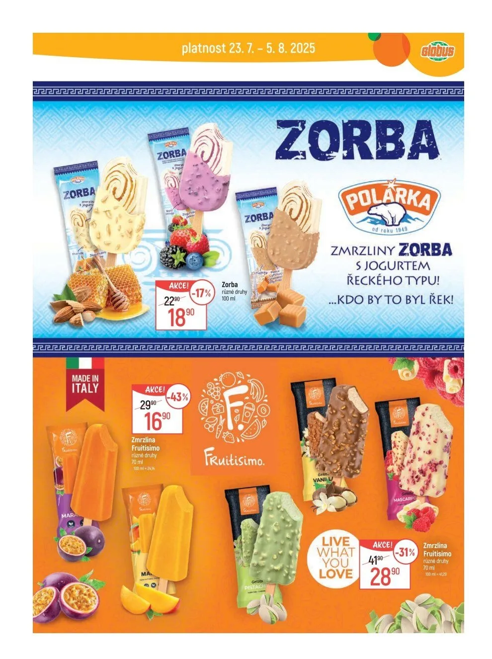 V letáku obchodu Globus najdete skvělé akce na zmrzliny Zorba a Fruitisimo!