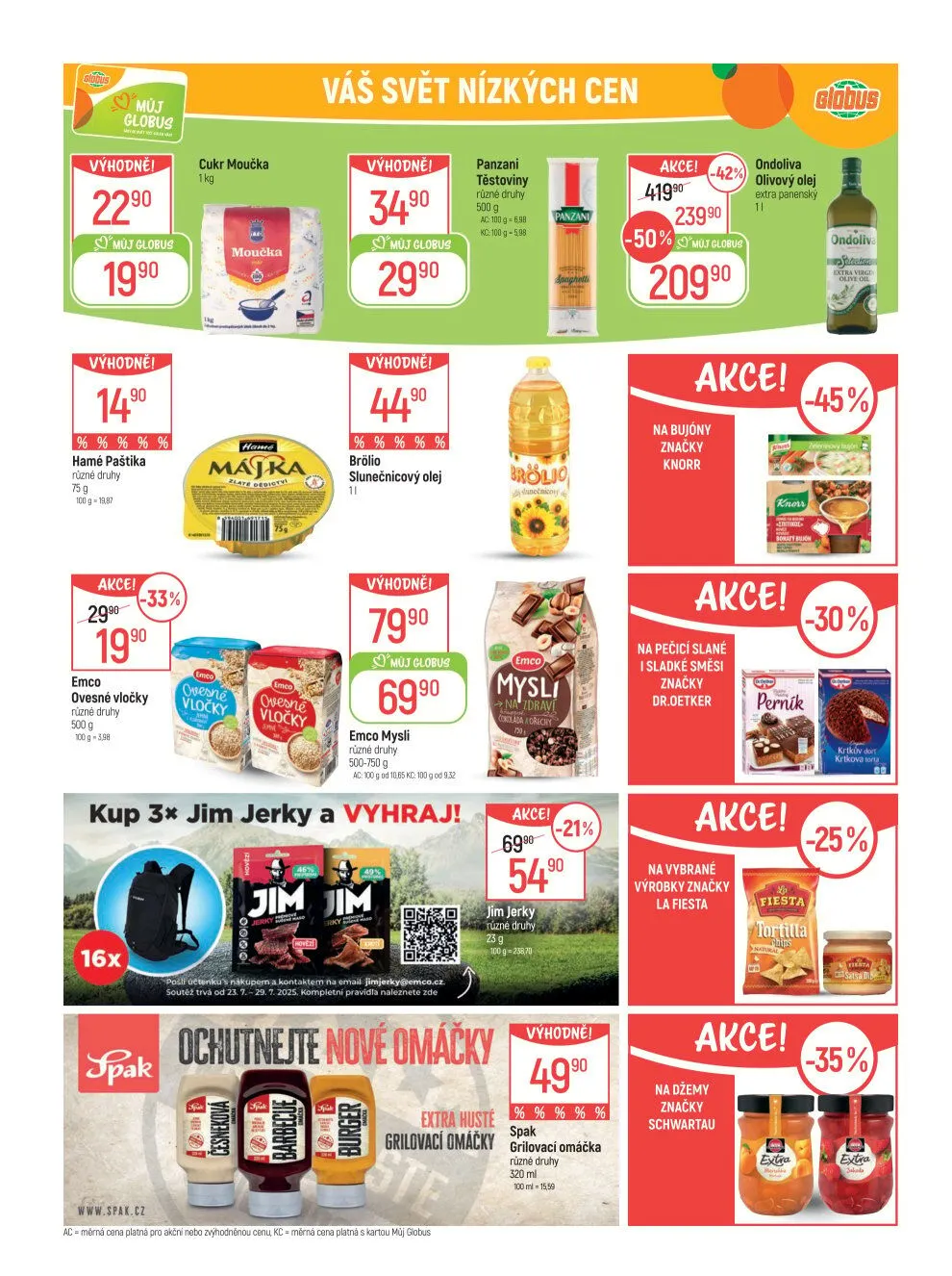 V letáku obchodu Globus najdete širokou nabídku výhodných produktů. Mezi nimi jsou různé druhy paštik Hamé, ovesné vločky a cukr moučka za skvělé ceny. Nezapomeňte na slunečnicový olej a těstoviny Panzani, které jsou také v akci. Pro milovníky olivového oleje je tu extra panenský olivový olej Ondoliva. Dále nabízíme bujóny značky Knorr a sladké i slané směsi Dr. Oetker. A pokud máte rádi grilování, vyzkoušejte naše grilovací omáčky. Navíc, při koupi 3 výrobků Jim Jerky můžete vyhrát zajímavé ceny! Nepropásněte tyto skvělé nabídky!
