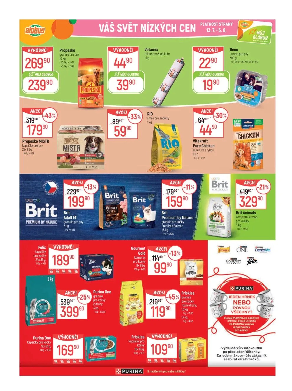 V letáku obchodu Globus najdete širokou nabídku výhodných produktů pro vaše domácí mazlíčky. Od 13.7. do 5.8. můžete využít akční ceny na granule a kapsičky pro psy a kočky. Například granule Brit Premium by Nature pro psy jsou nyní za 179,90 Kč a kapsičky Felix pro kočky za 189,90 Kč.
