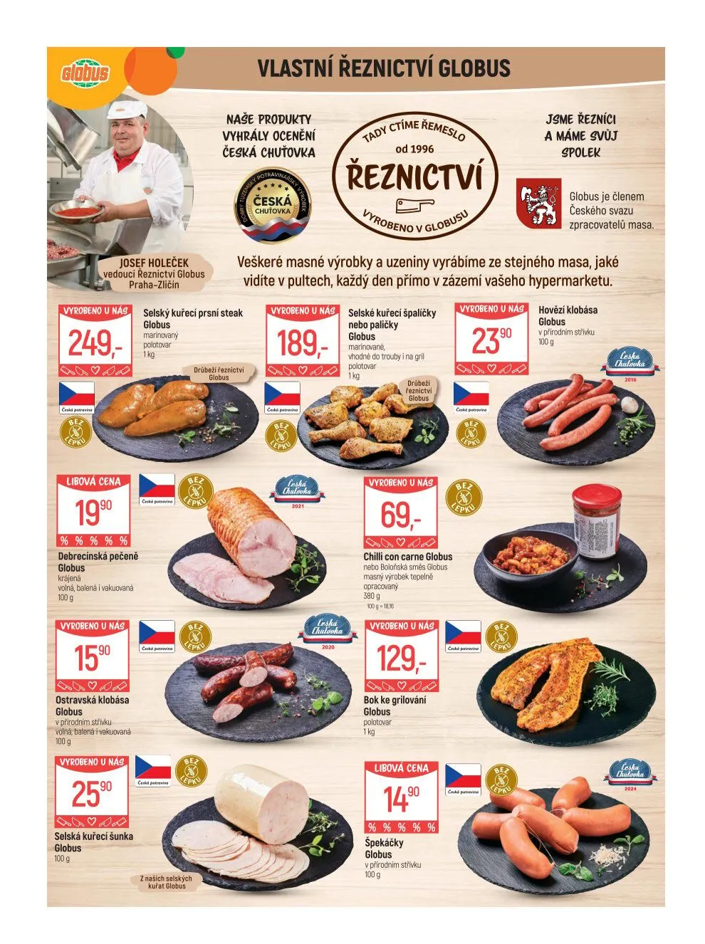 V letáku obchodu Globus najdete širokou nabídku kvalitních masných výrobků z vlastního řeznictví. Naše produkty, jako je selské kuřecí prsní steak a selské kuřecí špalíčky, jsou vyráběny přímo v zázemí hypermarketu. Všechny výrobky jsou vyrobeny z masa, které vidíte na pultech, a ctíme tradiční řemeslo od roku 1996.