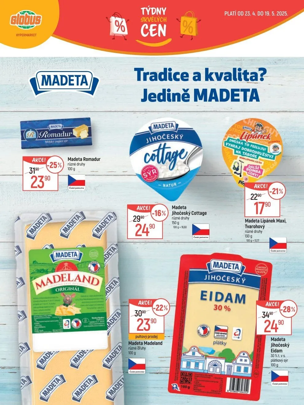 V letáku obchodu Globus najdete skvělé akce na produkty značky Madeta, které platí od 23.4. do 19.5.2025. Nabízíme různé druhy sýrů, jako je Madeta Romadur se slevou 25 % za 90 Kč za 100 g. Dále si můžete vychutnat Jihočeský cottage, který je také ve slevě 16 % za 150 g. Nezapomeňte na Madeta Lipánek Maxi, tvarohový sýr, který je k dostání v různých druzích za 130 g. A pro milovníky eidamu máme Jihočeský eidam plátky s 50 % tuku v sušině, který je nyní za 24,90 Kč za 100 g. Přijďte si vybrat z naší široké nabídky a užijte si tradici a kvalitu značky Madeta!