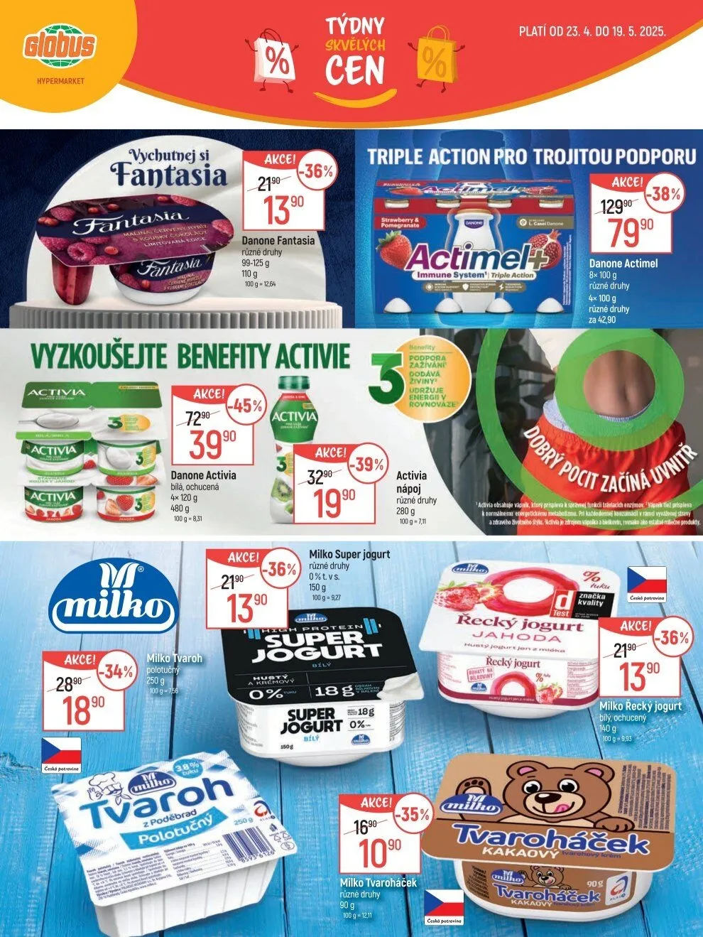 V letáku obchodu Globus najdete skvělé akce na produkty značky Danone. Od 23.4. do 19.5.2025 si můžete vychutnat různé druhy jogurtů, jako je Danone Activia, Actimel a Fantasia. Například Danone Activia v bílém nebo ochuceném provedení je nyní se slevou 36%.