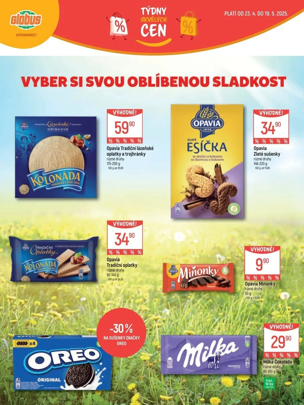 V letáku obchodu Globus najdete širokou nabídku sladkostí, které potěší každého milovníka sladkého. Od tradičních lázeňských oplatků Opavia v různých druzích (175-200 g) za skvělou cenu 34,90 Kč, až po oblíbené sušenky Oreo. Nezapomeňte také na Opavia zlaté sušenky (146-220 g) a miňonky v různých variantách, které jsou rovněž za výhodné ceny. A pro milovníky čokolády je tu Milka v různých druzích. Všechny produkty platí od 23.4. do 19.5.2025. Vyberte si svou oblíbenou sladkost a užijte si skvělou chuť!