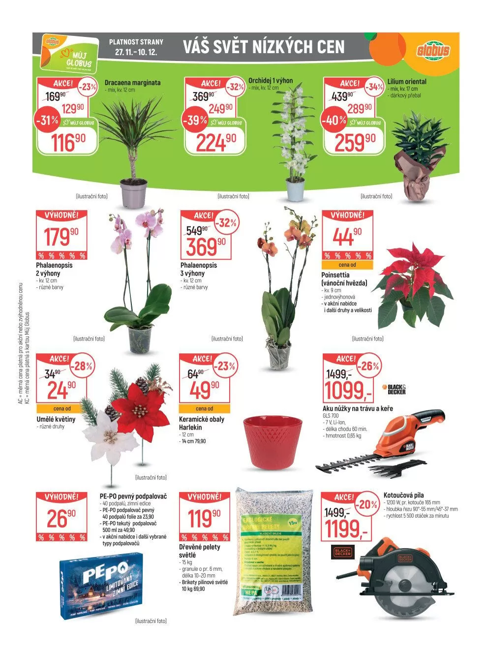 V obchodě Globus probíhá akce s nízkými cenami, která platí od 27.11. do 10.12. Mezi nabízenými produkty najdete různé rostliny a květiny. Například dracaena marginata je nyní za 116,90 Kč, phalaenopsis s dvěma výhony je k dispozici za 179,90 Kč a umělé květiny různých druhů začínají na ceně 24,90 Kč.