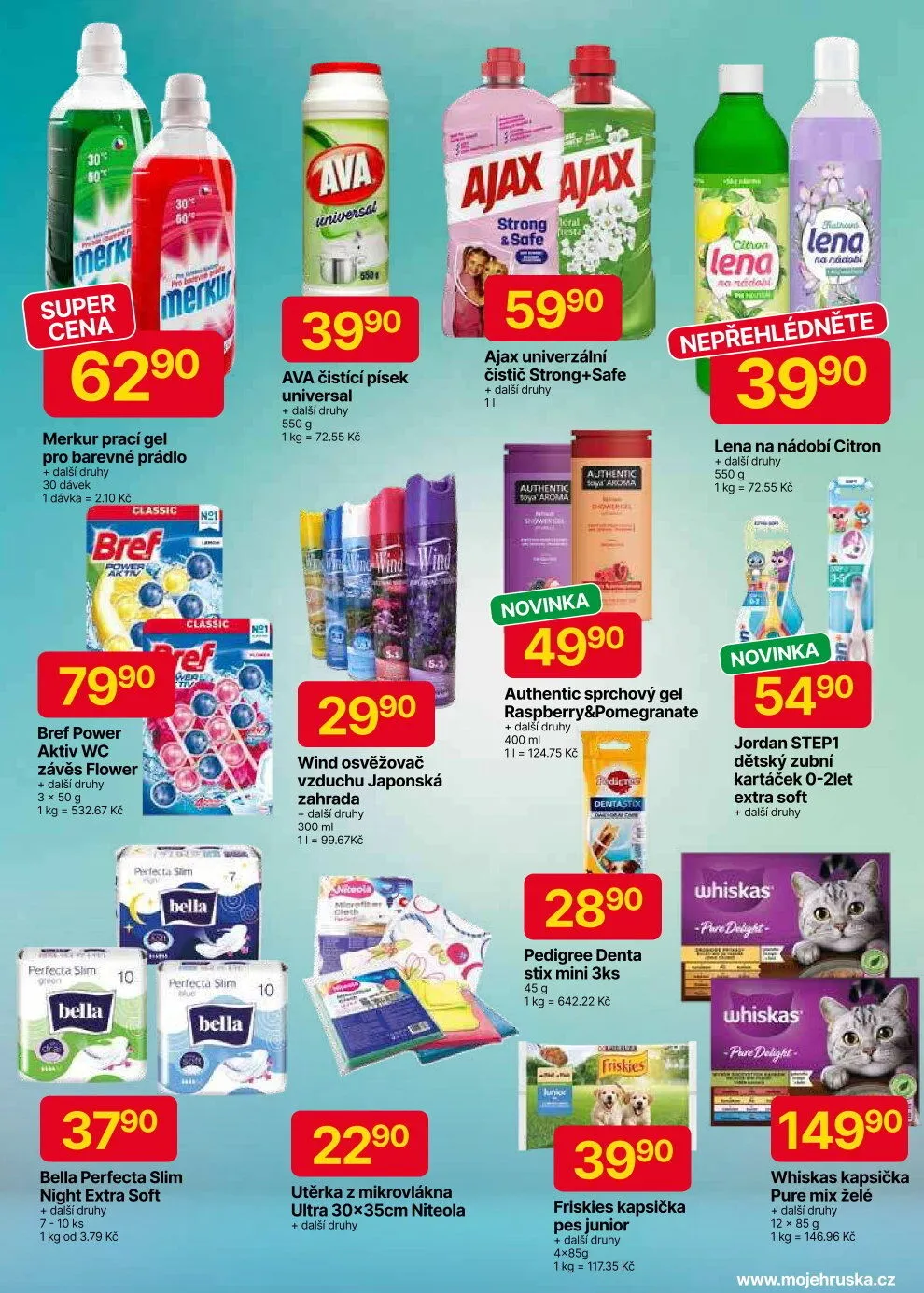 V letáku obchodu Hruška najdete širokou nabídku produktů za skvělé ceny. Mezi nimi je například Merkur prací gel pro barevné prádlo, který nabízí 30 dávek za cenu 629 Kč. Dále si můžete pořídit Bref Power aktivní WC závěs s vůní květin za 79 Kč.