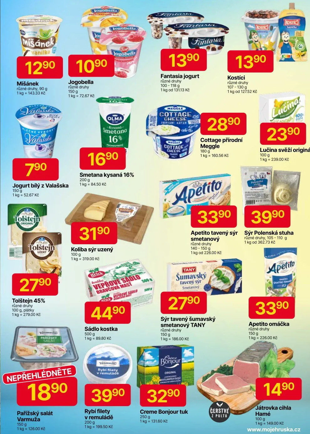 Pro milovníky sýrů máme uzený sýr Koliba a tavené sýry Apetito a Tany, které jsou k dostání v různých variantách. Nezapomeňte také na lahodný pařížský salát a játrovku od Hamé.