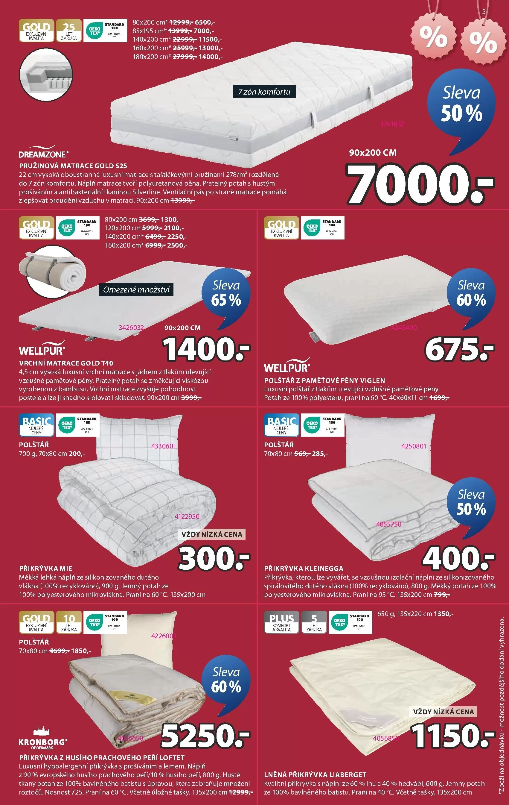 V letáku obchodu Jysk najdete širokou nabídku kvalitních produktů pro váš domov. Mezi hlavními položkami se nachází pružinová matrace Gold S25, která je k dispozici v různých rozměrech a nabízí 7 zón komfortu pro maximální pohodlí. Dále si můžete pořídit luxusní vrchní matraci Gold T40, která zvyšuje pohodlnost postele a je snadno skladovatelná.