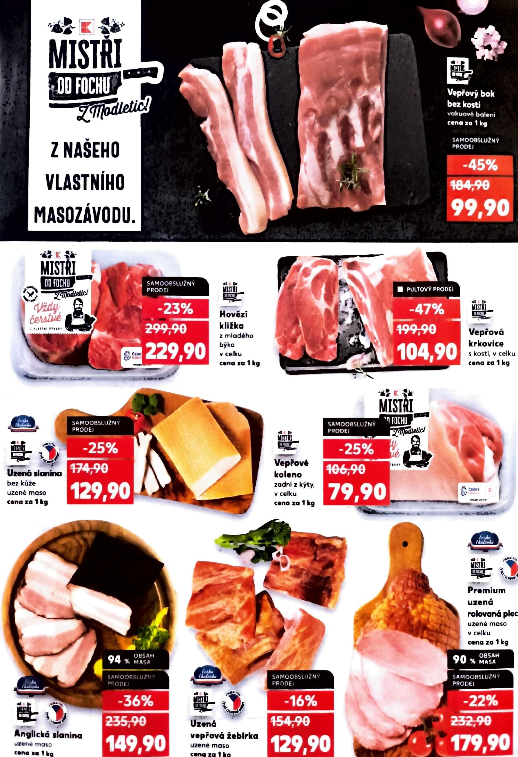 V letáku obchodu Kaufland najdete širokou nabídku kvalitních masných výrobků z našeho vlastního masozávodu. Mezi hlavními produkty se nachází vepřový bok bez kosti v vakuovém balení, který je nyní za skvělou cenu 99,90 Kč za 1 kg, s 45% slevou. Dále nabízíme hovězí kližku z mladého býka v celku za 229,90 Kč za 1 kg, s 23% slevou.