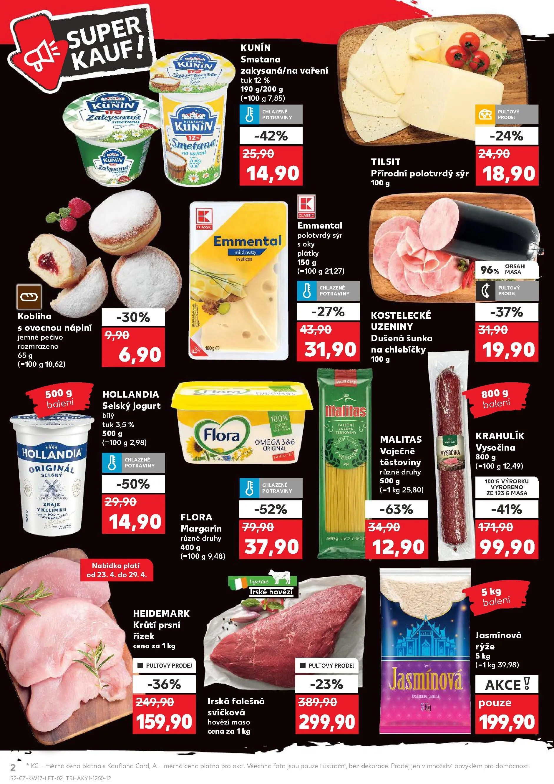 V letáku obchodu Kaufland najdete širokou nabídku produktů za skvělé ceny. Mezi nimi je smetana Kunín s tukem 12 % za 7,95 Kč (sleva 42 %). Dále nabízíme emmental polotvrdý sýr v plátcích za 31,90 Kč (sleva 27 %). Nezapomeňte na dušenou šunku Kostelecké uzeniny za 10,62 Kč/100 g.
