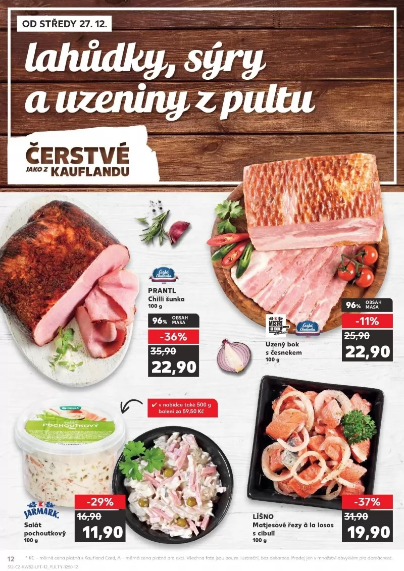 jakoz kauflandu prantl chilli šunka 100 g oasah 96% masa -36% 22,90 salát pochoutkový 100 g 12 od středy 27.12. lahůdky, sýry a uzeninwz pultu čerstvé oei ?uzený bok s česnekem 100 g obsah masa -110,6 22,90