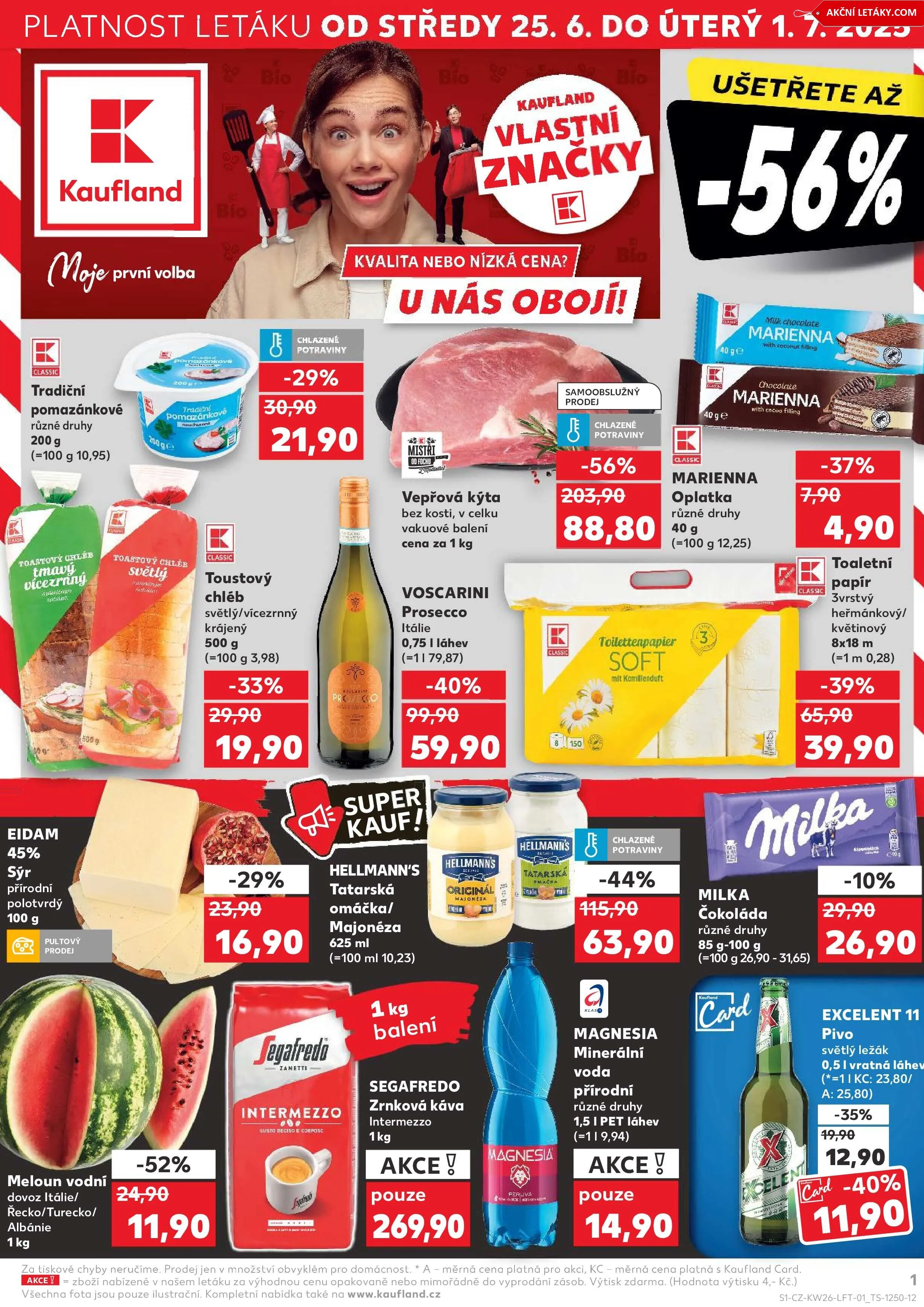 V letáku Kaufland od 25. června do 1. července 2025 najdete širokou nabídku produktů za skvělé ceny. Mezi tradičními pomazánkovými produkty si můžete vybrat různé druhy za 10,95 Kč za 200 g. Ušetřete až 29 % na toustovém chlebu, který je k dostání za 19,90 Kč za 500 g.