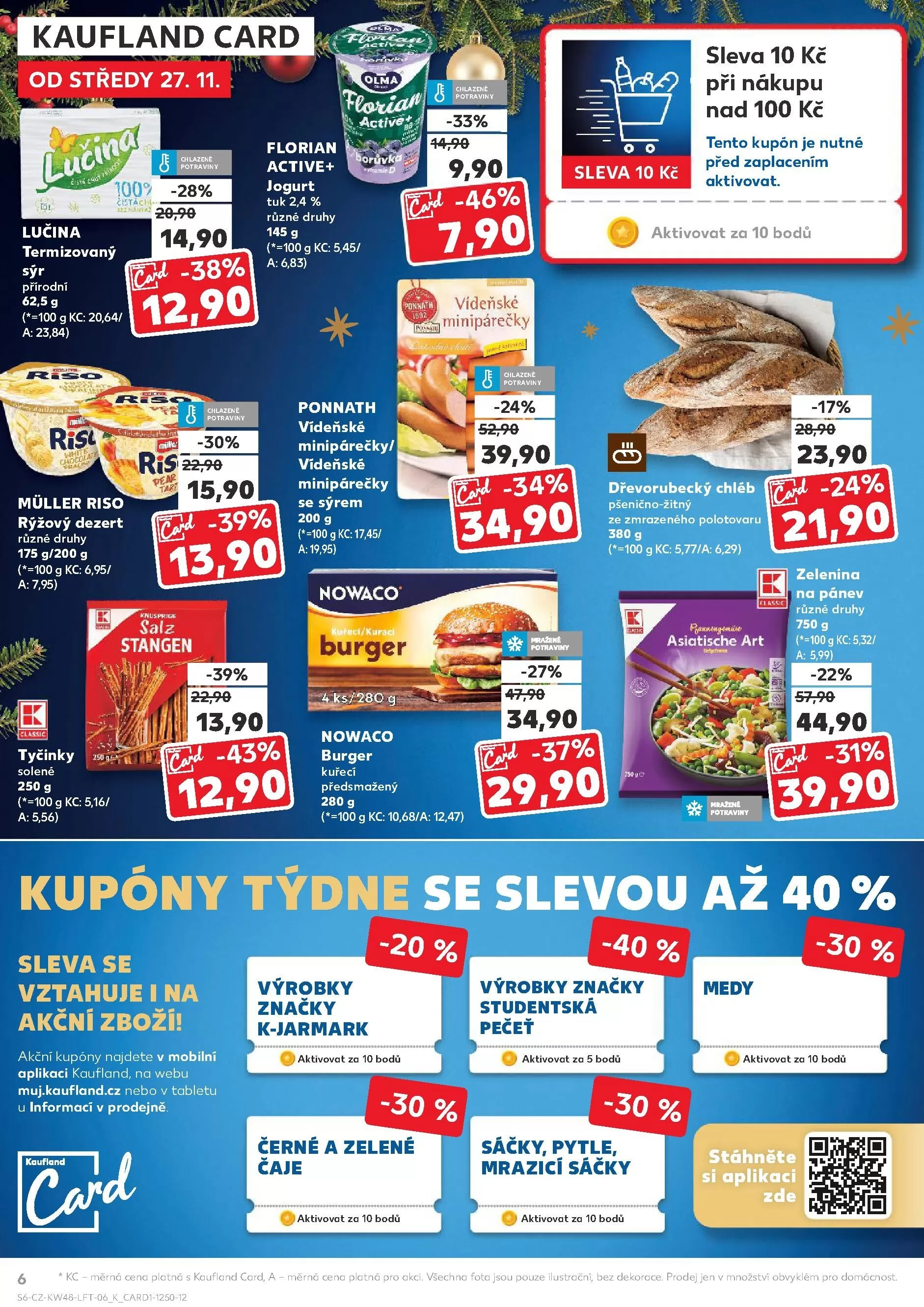 V letáku obchodu Kaufland najdete širokou nabídku produktů se slevami až 46 %. Mezi zajímavé položky patří vídeňské minipárečky, které jsou nyní za 1,90 Kč, a termitovaný sýr Lucina za 62,59 Kč. Nezapomeňte využít slevový kupón na 10 Kč při nákupu nad 100 Kč, který je nutné aktivovat před zaplacením.