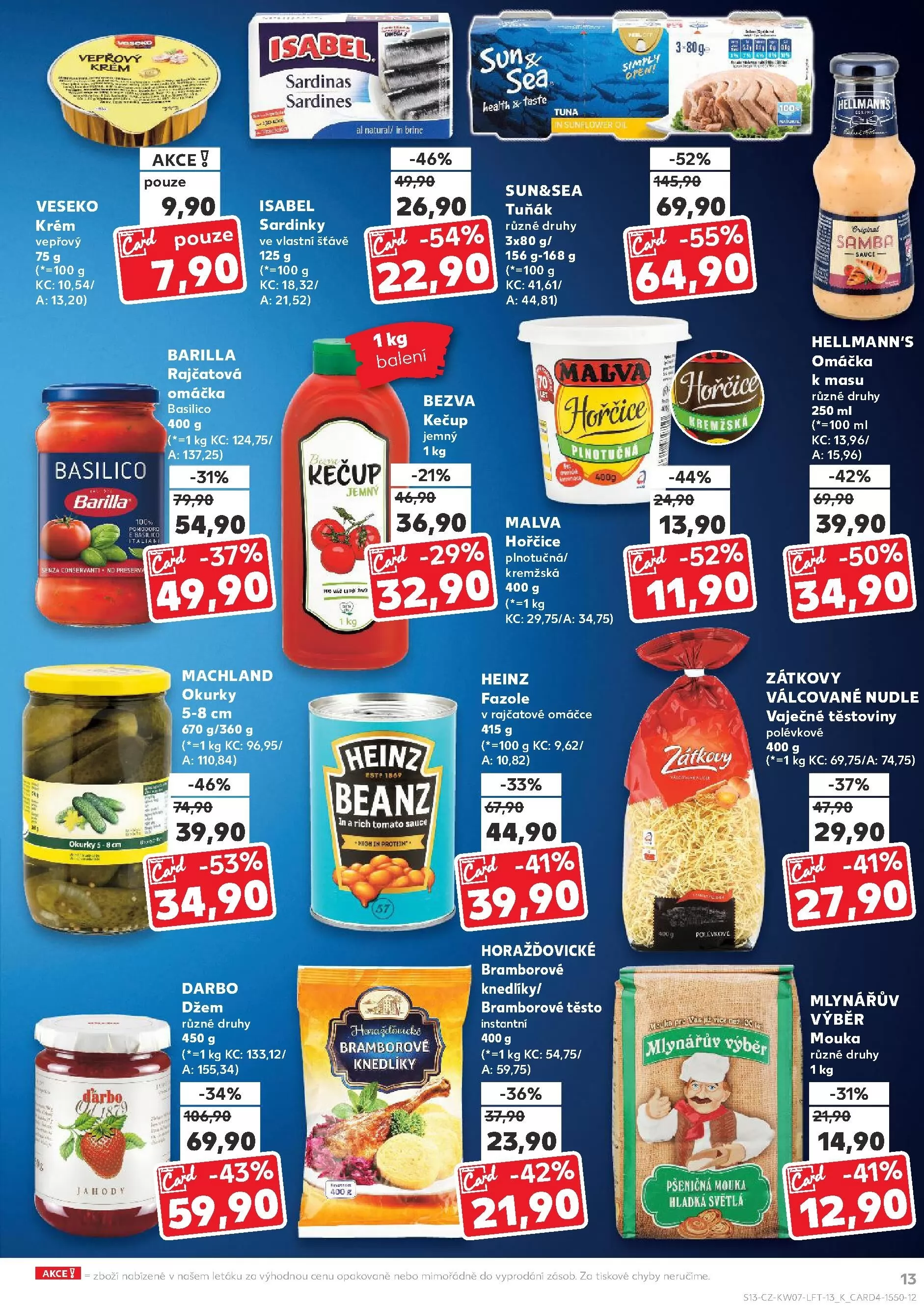 V letáku obchodu Kaufland najdete širokou nabídku produktů za skvělé ceny. Například vepřový krém 75 g je nyní za akční cenu 9,90 Kč. Rajčatová omáčka Barilla Basilico 400 g je k dostání za 22,90 Kč. Pro milovníky ryb jsou tu sardinky Isabel ve vlastní šťávě 125 g za 18,32 Kč a tuňák Sun&Sea v různých druzích 3x80 g za 64,90 Kč.