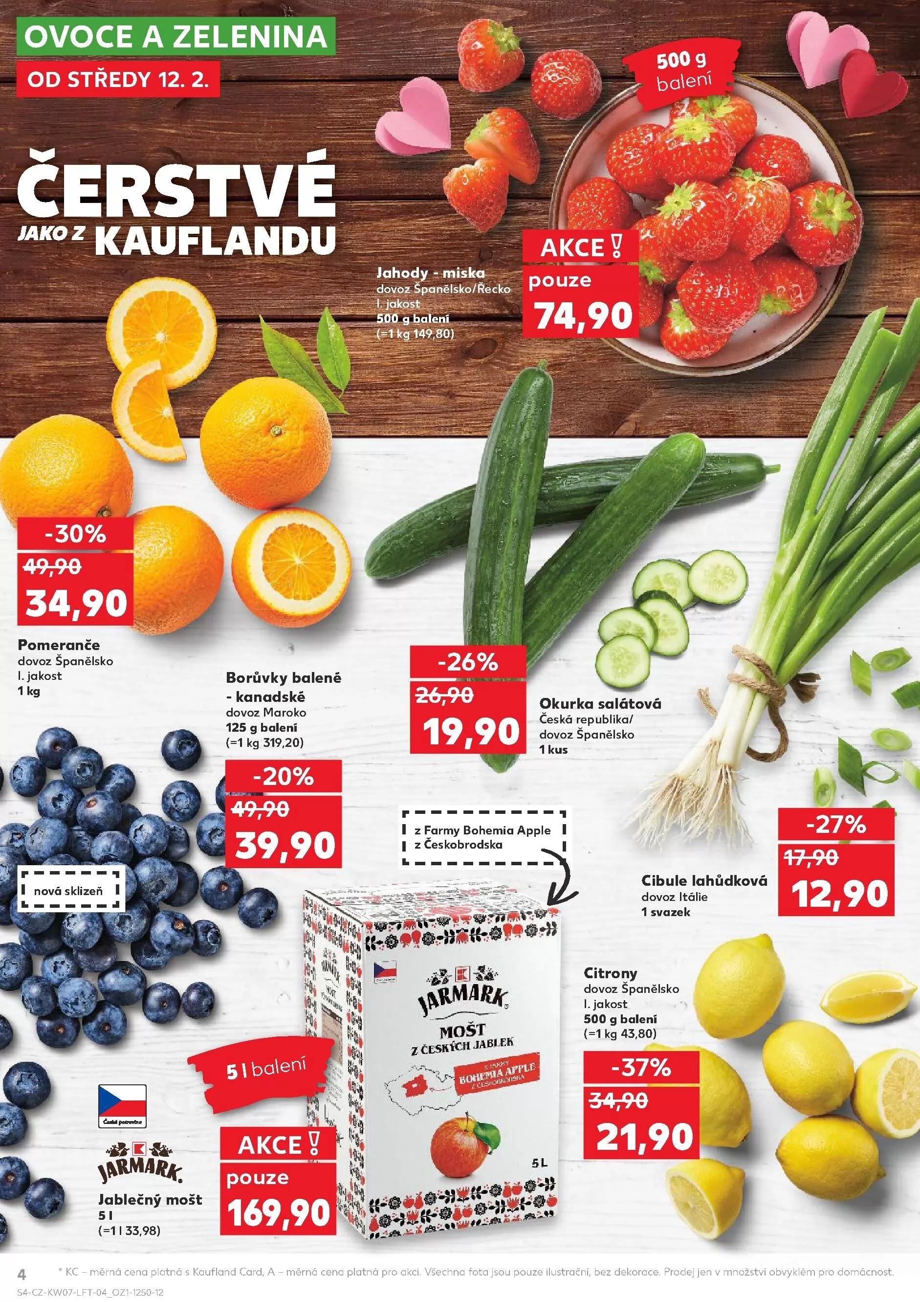 V letáku obchodu Kaufland najdete širokou nabídku čerstvého ovoce a zeleniny. Od středy 12.2. si můžete zakoupit jahody z dovozu Španělska a Řecka v 500 g balení za akční cenu 34,90 Kč, což je sleva 30%. Pomeranče, také z dovozu Španělska, jsou k dispozici za 39,90 Kč za kilogram.