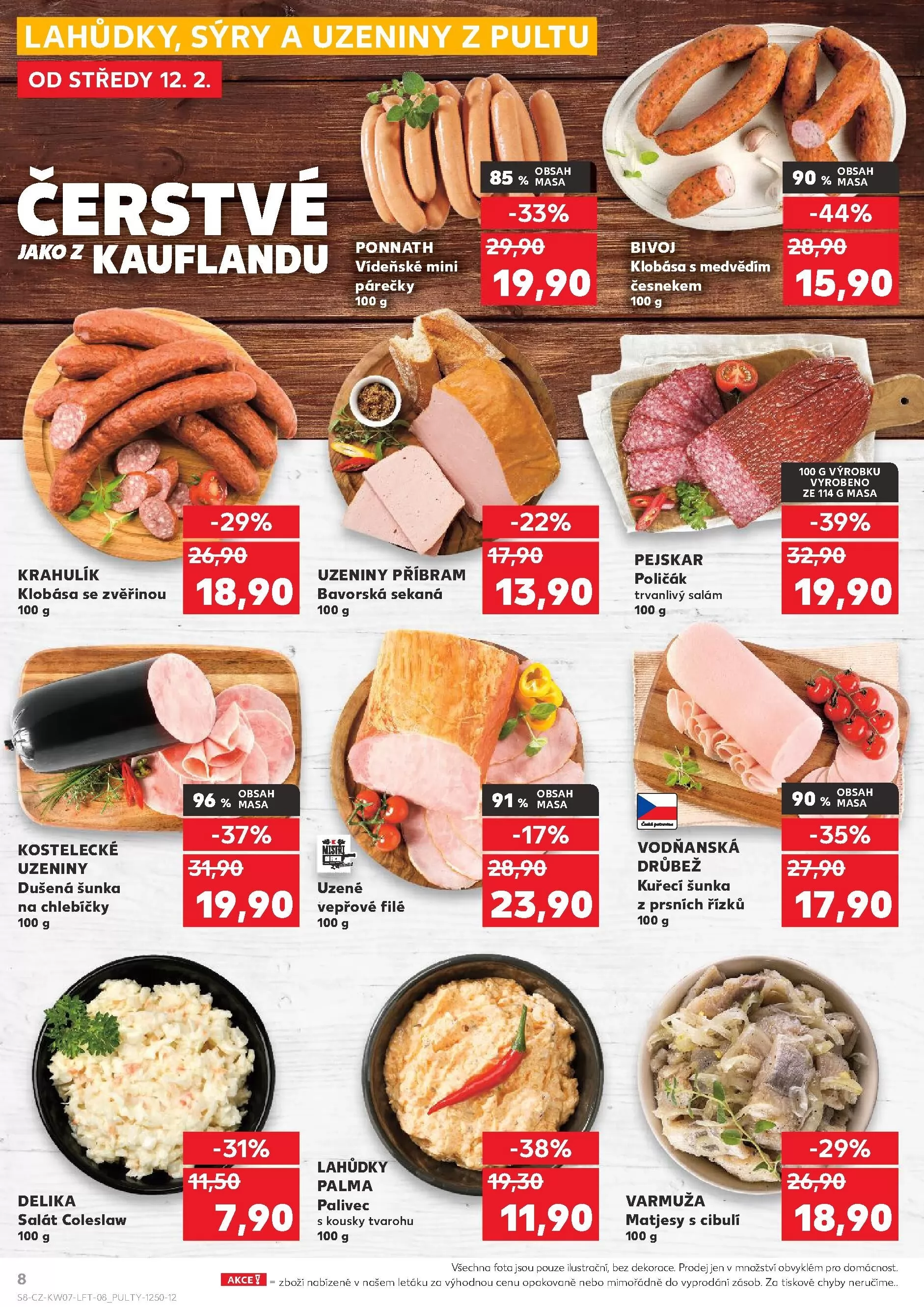 V letáku obchodu Kaufland najdete širokou nabídku čerstvých uzenin a lahůdek. Mezi nimi se objevují vídeňské mini párečky od značky Ponnath, klobása se zvěřinou od Krahulíka a dušená šunka na chlebíčky od Kosteleckých uzenin. Nechybí ani salát coleslaw od Deliky, bavorská sekaná a uzené vepřové filé.