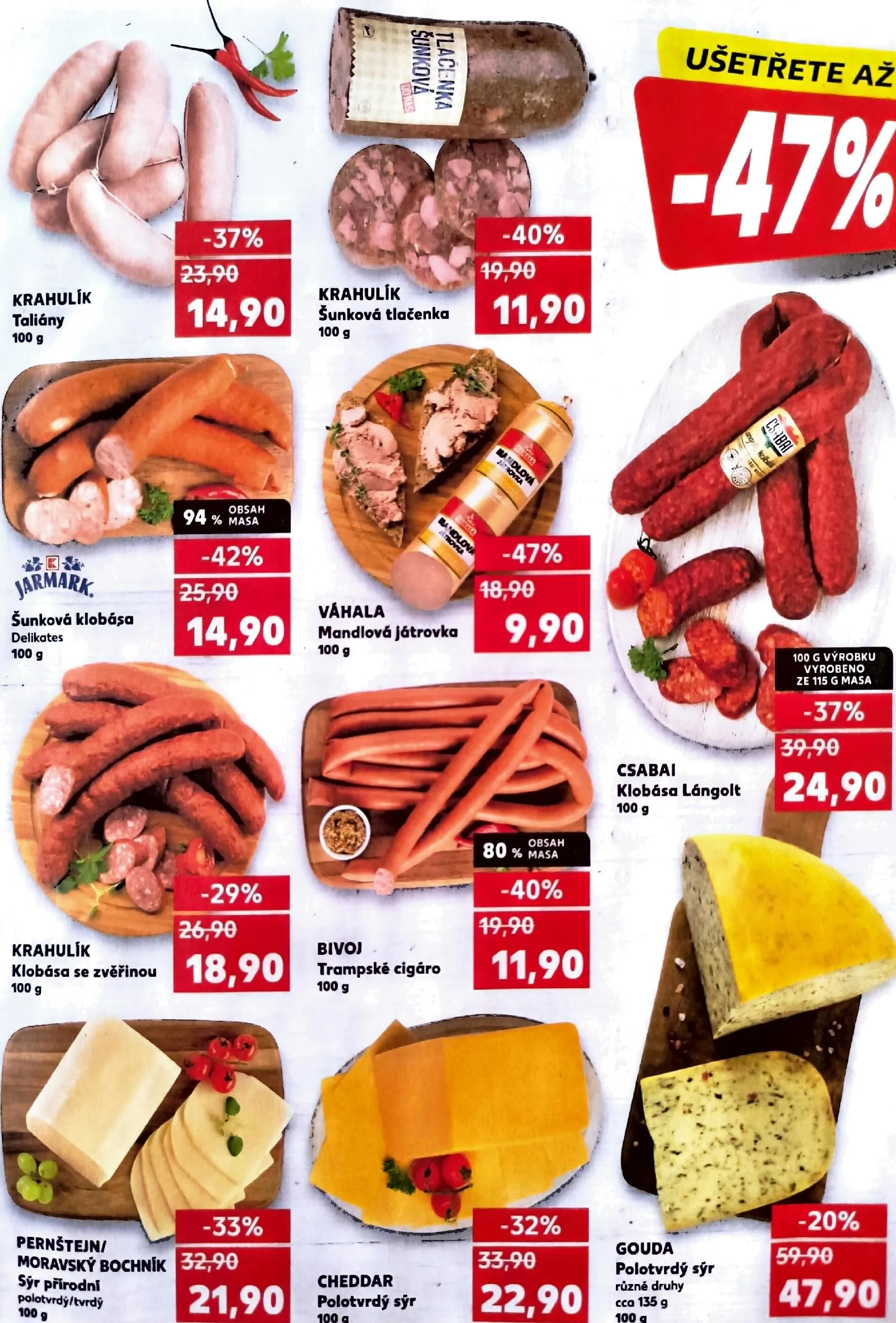 V letáku obchodu Kaufland najdete skvělé akční nabídky na různé masné výrobky a sýry. Ušetřete až 42 % na šunkové klobáse, která je nyní za 14,90 Kč za 100 g. Také si můžete dopřát klobásu se zvěřinou od značky Krahulík za 18,90 Kč. Pro milovníky sýrů je k dispozici polotvrdý sýr Gouda za 11,90 Kč, což představuje slevu 40 %. Nezapomeňte také na šunkovou tlačenku a mandlovou játrovku, které jsou v akci za výhodné ceny. Využijte těchto skvělých nabídek a doplňte svůj nákup o kvalitní produkty!