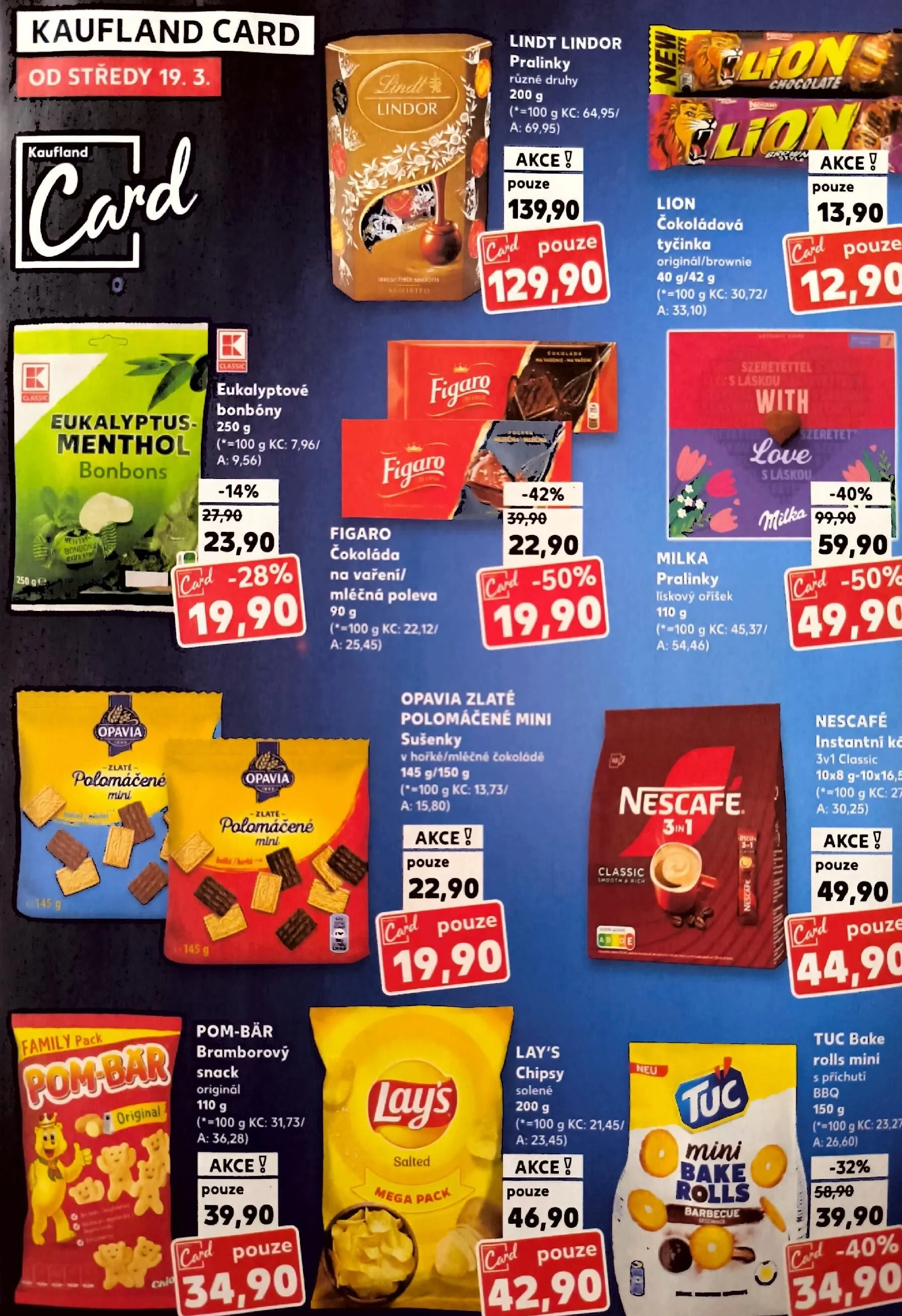 V letáku obchodu Kaufland najdete skvělé akce na široký výběr produktů. Od středy 19.3. si můžete pořídit čokoládu Lindor a Figaro, které jsou nyní za výhodné ceny. Pralinky Lindt Lindor různých druhů za 139,90 Kč a čokoládové tyčinky Lion za 12,90 Kč.