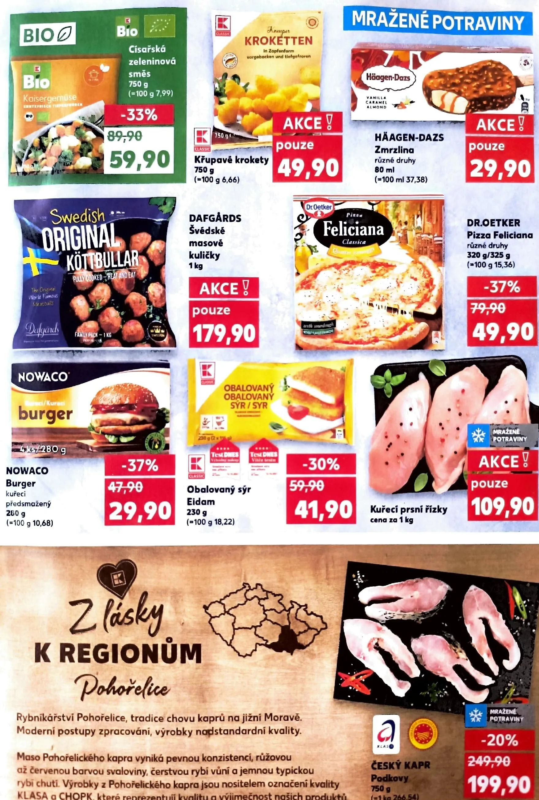 V letáku obchodu Kaufland najdete širokou nabídku produktů za skvělé ceny. Mezi nimi se objevují kuřecí předsmažené kousky o hmotnosti 200 g za 29,90 Kč, nebo bio cisařská zeleninová směs 750 g za 59,90 Kč. Pokud máte rádi masové pokrmy, vyzkoušejte švédské masové kuličky od značky Dafg?rds za 179,90 Kč.