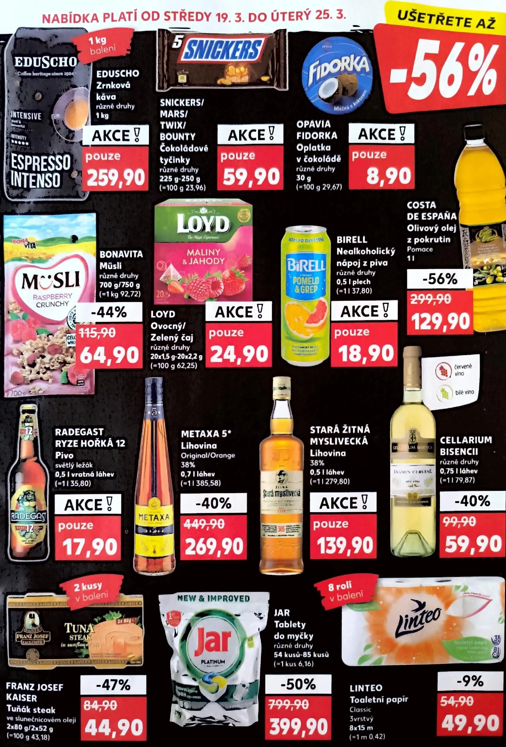 V letáku obchodu Kaufland najdete skvělé akční nabídky platné od středy 19.3. do úterý 25.3. Ušetřete na různých produktech, jako je zrnková káva Eduscho, která je k dispozici v různých druzích za cenu 259,90 Kč. Milovníci čokolády ocení akci na tyčinky Snickers, Mars, Twix a Bounty, které pořídíte za 59,90 Kč.