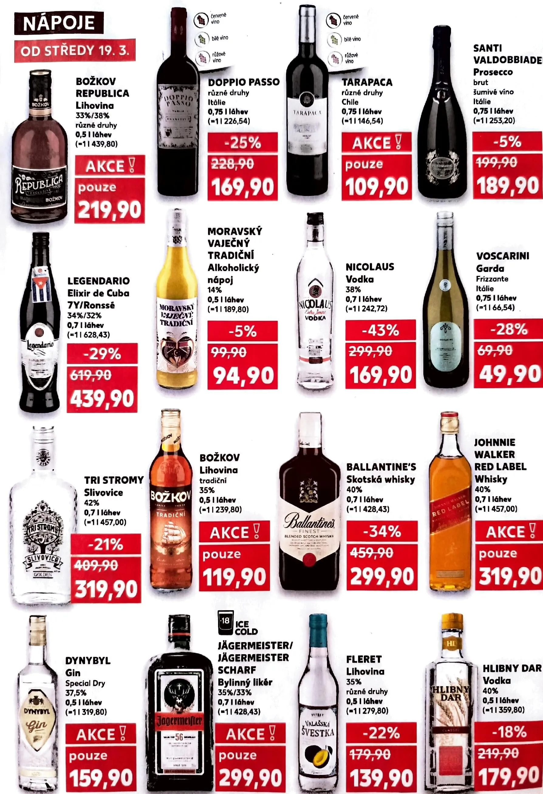 V letáku obchodu Kaufland od středy 19.3. najdete širokou nabídku nápojů za akční ceny. Mezi nimi se objevují: