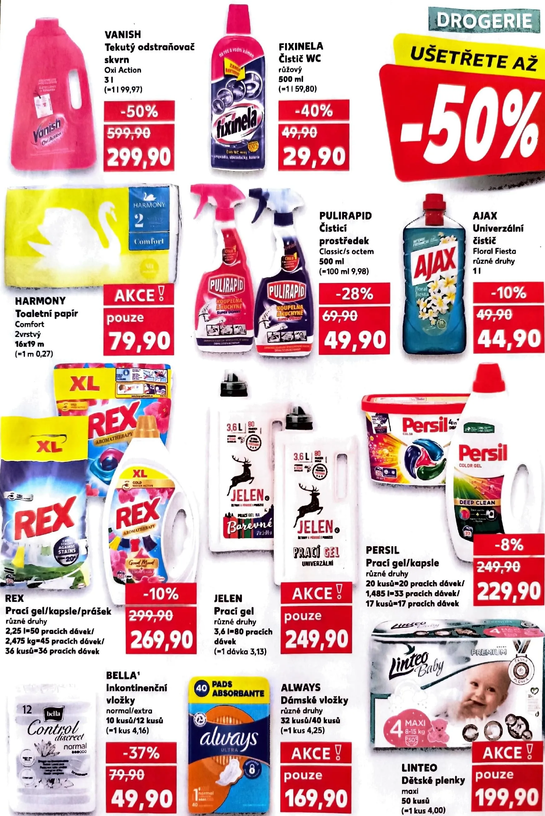 V kategorii pracích prostředků najdete například prací gel Rex, který nabízí různé druhy a balení, a to za 249,90 Kč. Nezapomeňte také na dámské vložky Always, které jsou k dostání za 169,90 Kč.