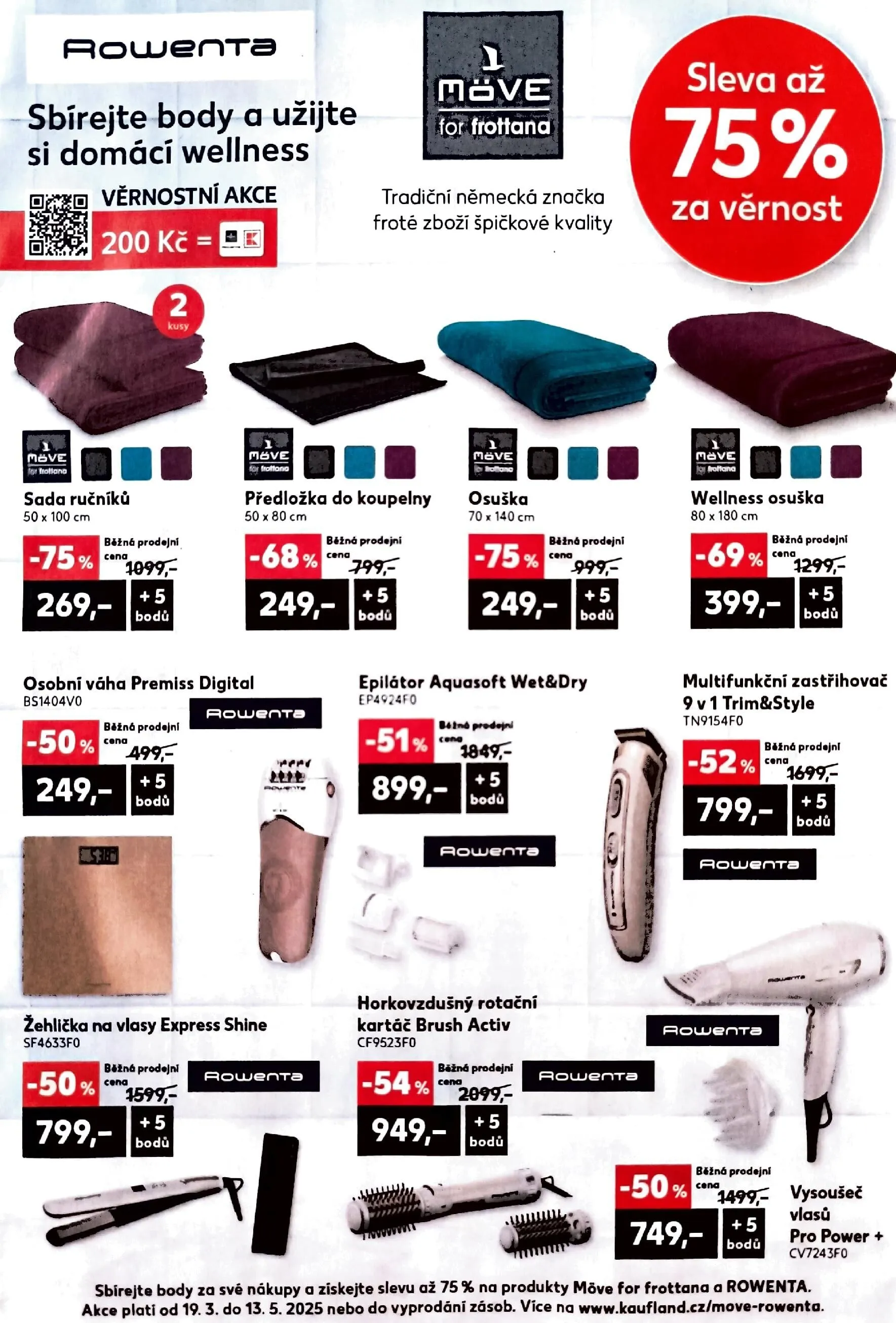 Využijte akci a získejte slevu až 75 % na produkty Möve for Frottana a Rowenta. Akce platí od 19.3. do 13.5.2025 nebo do vyprodání zásob. Více informací na www.kaufland.cz/move-rowenta.