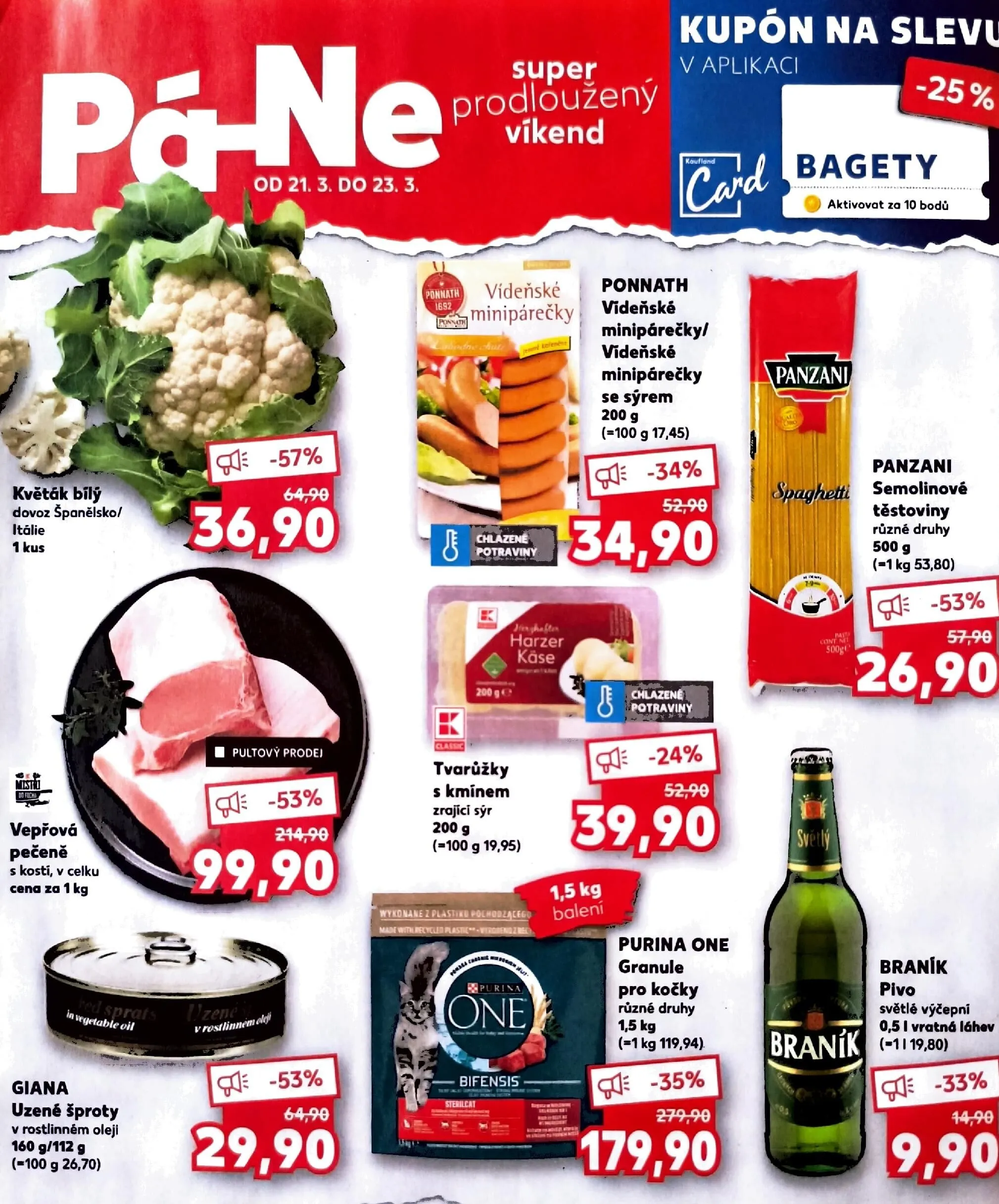 Dále si můžete pořídit semolinové těstoviny Panzani za 26,90 Kč nebo čerstvý květák bílý z dovozu za 9,90 Kč.