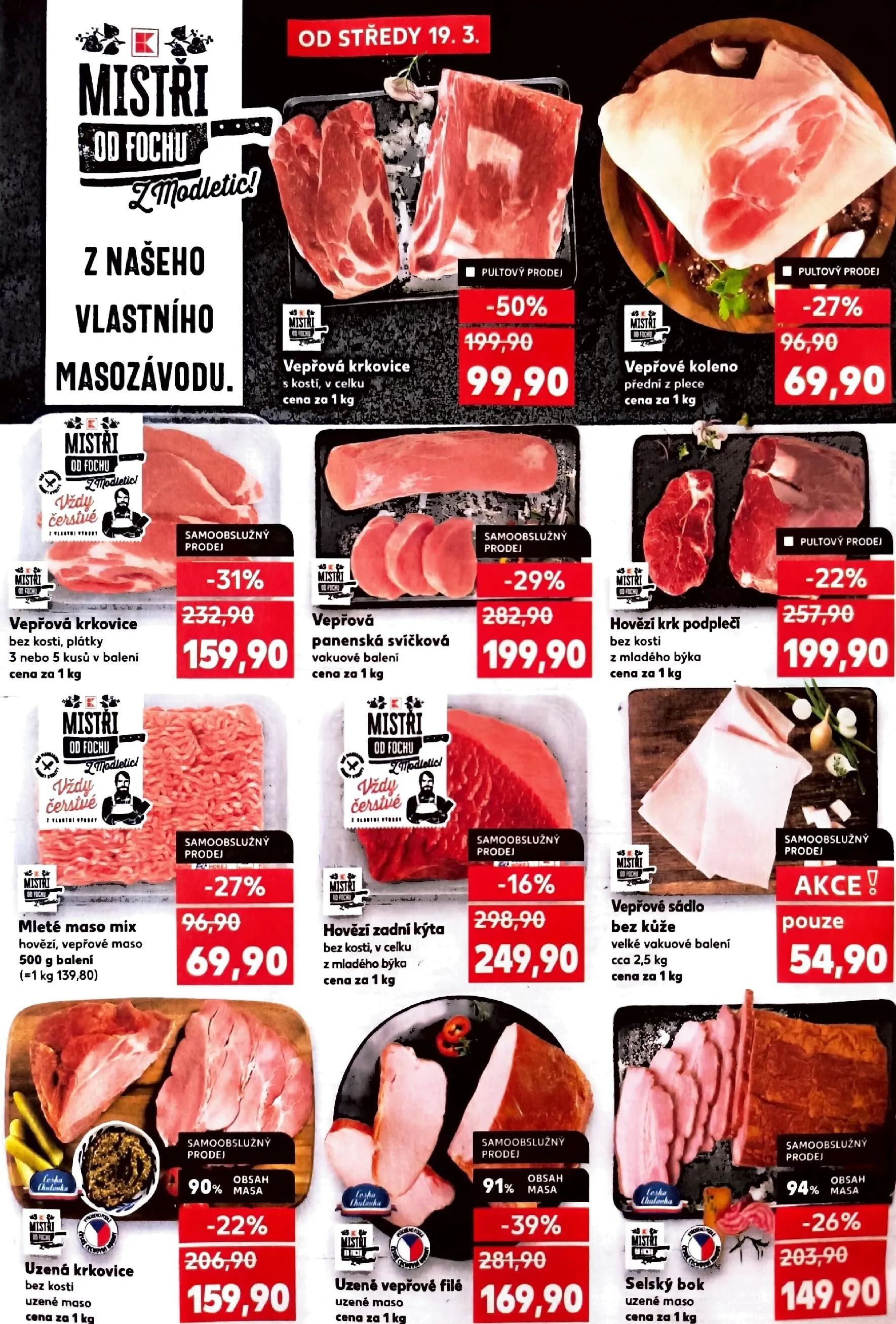 V letáku obchodu Kaufland najdete širokou nabídku kvalitních masných výrobků z našeho vlastního masozávodu. Od středy 19.3. probíhá pultový prodej s výraznými slevami.