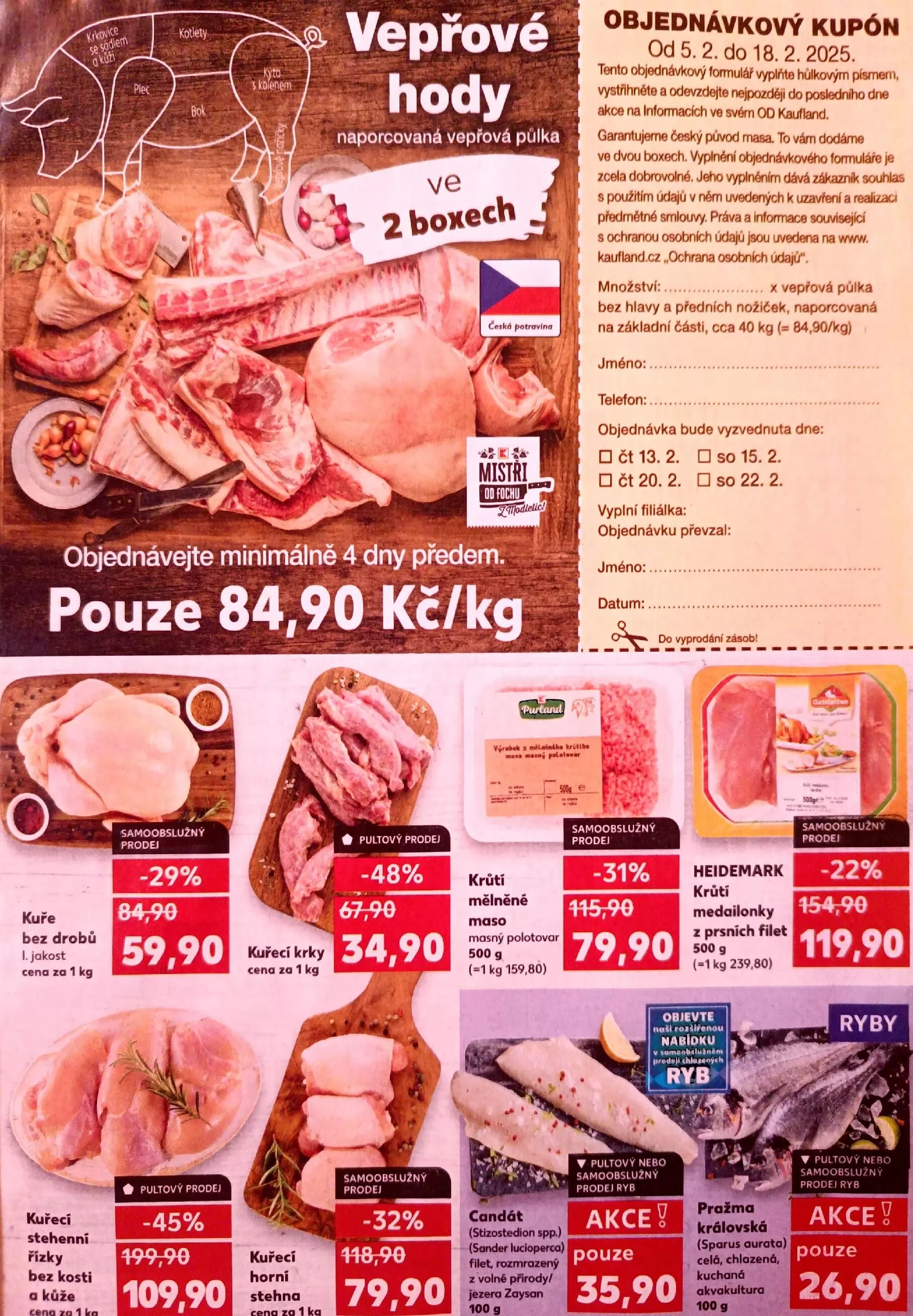 V letáku obchodu Kaufland najdete širokou nabídku kvalitních masných výrobků a ryb. Mezi hlavními produkty se objevují vepřové kotlety a naporcovaná vepřová půlka, které jsou garantovány českého původu. Cena za vepřovou půlku je 84,90 Kč/kg. Dále si můžete objednat kuřecí stehenní řízky bez kosti a kůže za 59,90 Kč/kg, nebo krůtí medailonky z prsních filet za 79,90 Kč/500 g.