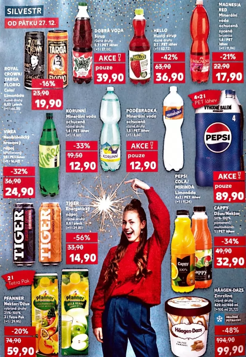 V letáku obchodu Kaufland najdete skvělé akce na různé produkty, ideální pro silvestrovské oslavy. Od pátku 27.12. si můžete pořídit hustý sirup Hello za pouhých 36,90 Kč, což je o 42% méně než obvykle.