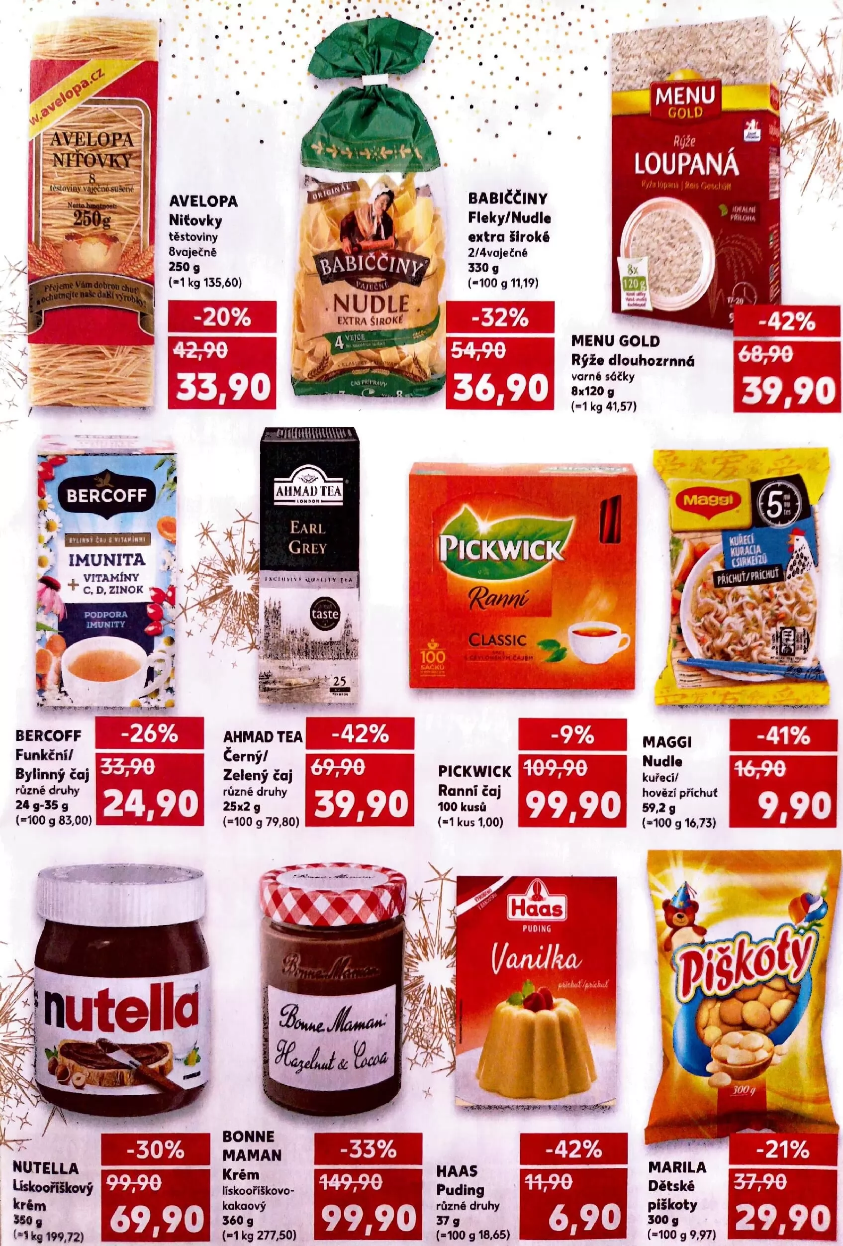 V letáku obchodu Kaufland najdete širokou nabídku produktů, které potěší každého zákazníka. Mezi nimi jsou například těstoviny, jako jsou babiččiny nudle a široké fleky, které jsou nyní za skvělé ceny. Nezapomeňte také na funkční bylinné čaje značky Bercoff, které podporují imunitu, nebo na černý a zelený čaj od Ahmad Tea.