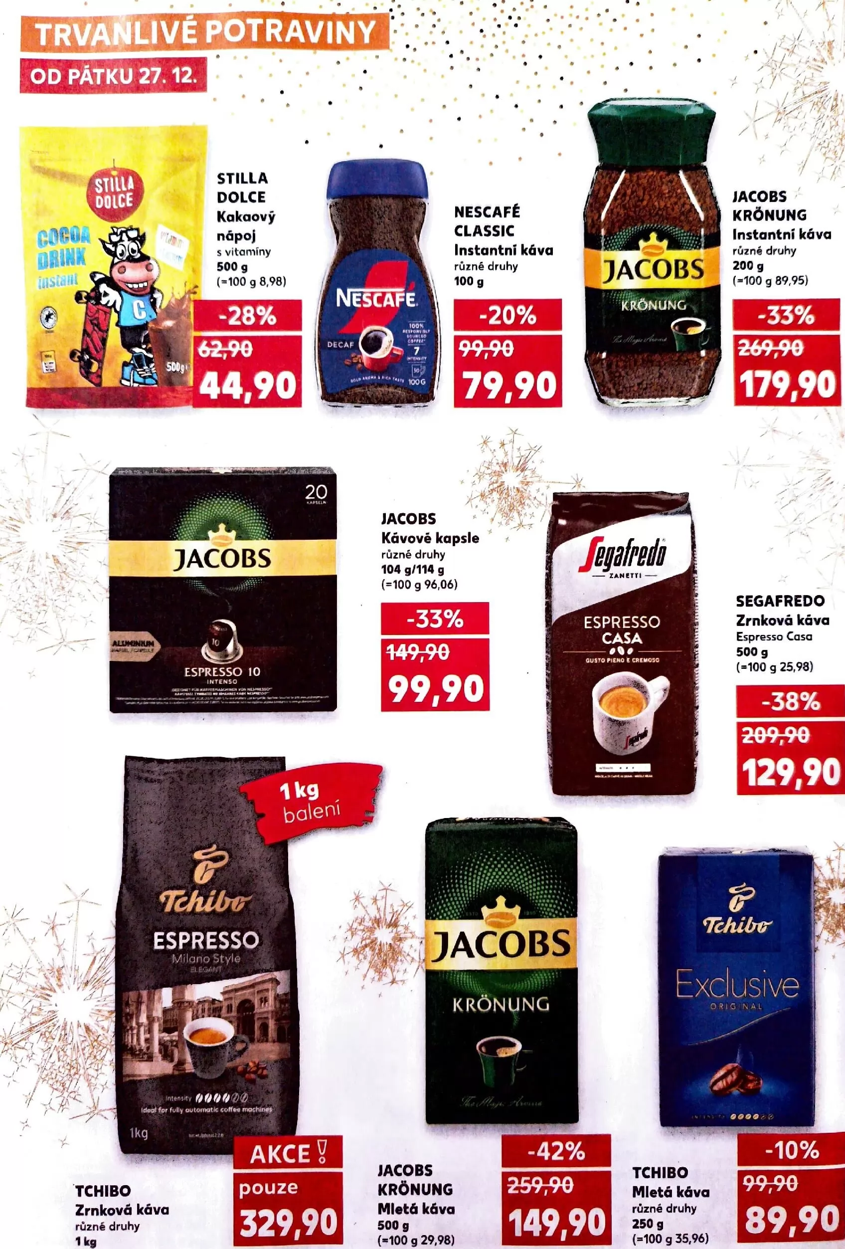 V letáku obchodu Kaufland najdete širokou nabídku trvanlivých potravin, které potěší každého milovníka kávy. Od pátku 27.12. si můžete zakoupit kakaový nápoj s vitamíny o hmotnosti 500 g za skvělou cenu 44,90 Kč, což představuje slevu 28%.