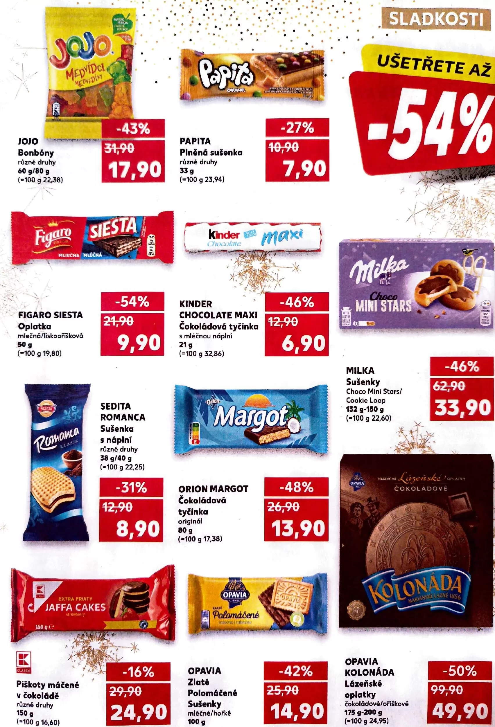 A konečně, čokoládové tyčinky Orion Margot a polomáčené sušenky Opavia Zlať jsou skvělou volbou za 13,90 Kč a 14,90 Kč. Využijte těchto skvělých nabídek a dopřejte si něco sladkého!