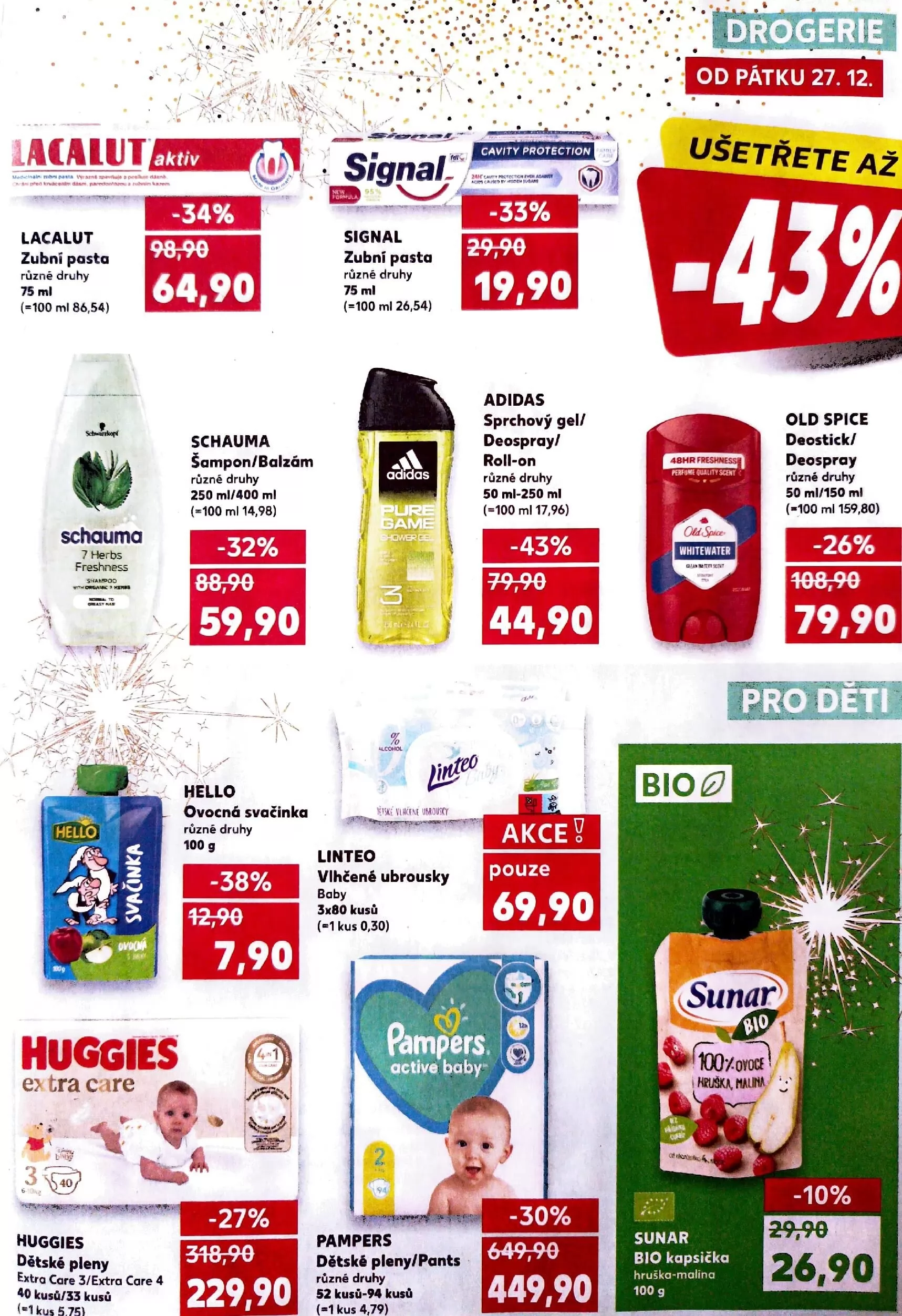 V letáku obchodu Kaufland od pátku 27.12. najdete skvělé akce na drogerii. Ušetřete až na produktech jako je zubní pasta Lacalut a Signal, různé druhy po 75 ml. Šampony a balzámy Schauma s bylinkami jsou nyní za výhodnou cenu 59,90 Kč. Pro děti nabízíme Huggies pleny Extra Care a Pampers s výraznou slevou. Nezapomeňte také na ovocné svačinky Hello a bio kapsičky Sunar. Využijte akční ceny na vlhčené ubrousky Linteo a sprchové gely Adidas. Přijďte si pro své oblíbené produkty a ušetřete!