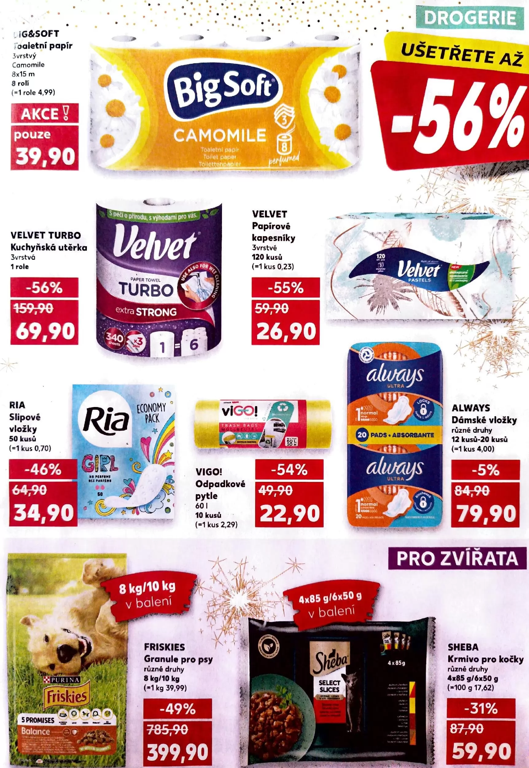 V letáku obchodu Kaufland najdete širokou nabídku produktů za skvělé ceny. Mezi nimi je 3vrstvý toaletní papír Bigsoft s vůní heřmánku, který je k dispozici v balení 8 rolí za akční cenu 39,90 Kč. Dále si můžete pořídit kuchyňské utěrky Velvet Turbo, které jsou také 3vrstvé a nyní za pouhých 69,90 Kč.