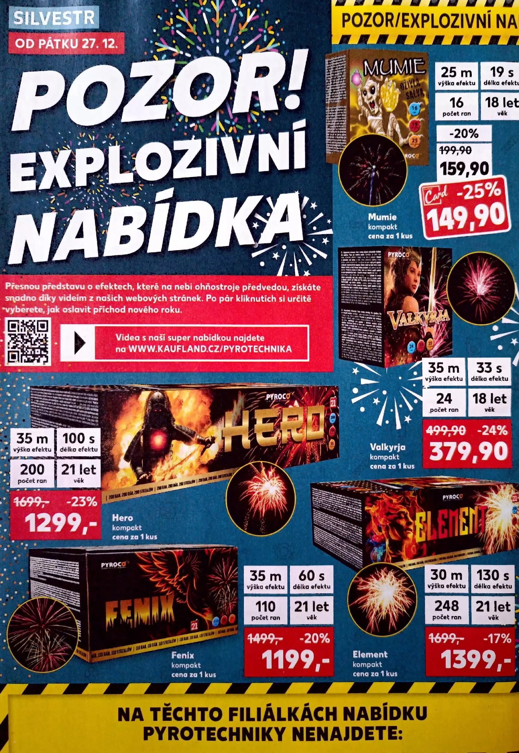 V letáku obchodu Kaufland najdete širokou nabídku pyrotechniky, která vám pomůže oslavit příchod nového roku. Mezi produkty se nachází ohňostroje s různými efekty a výškami. Například ohňostroj "mumie" nabízí výšku efektu 25 m a 16 ran za cenu 159,90 Kč. Další variantou je "hero", který dosahuje výšky 35 m a má 24 ran, přičemž jeho cena je 1 299 Kč.
