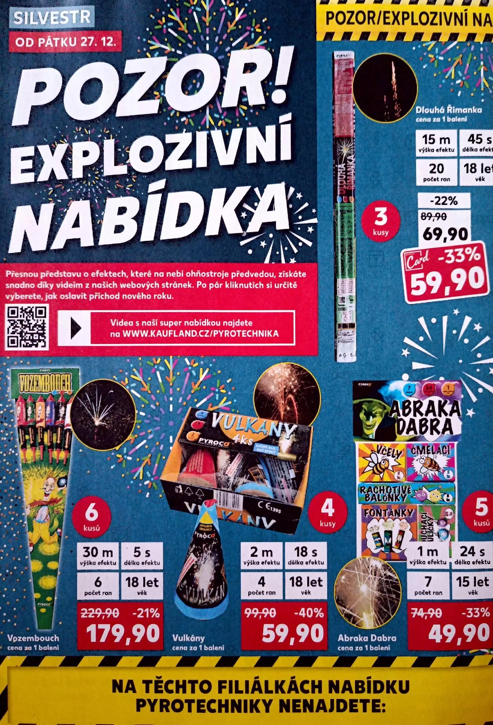 V letáku obchodu Kaufland najdete širokou nabídku pyrotechniky, která vám pomůže oslavit příchod nového roku. Můžete si prohlédnout videa s efekty ohňostrojů na našich webových stránkách, abyste si udělali přesnou představu o tom, co vás čeká.
