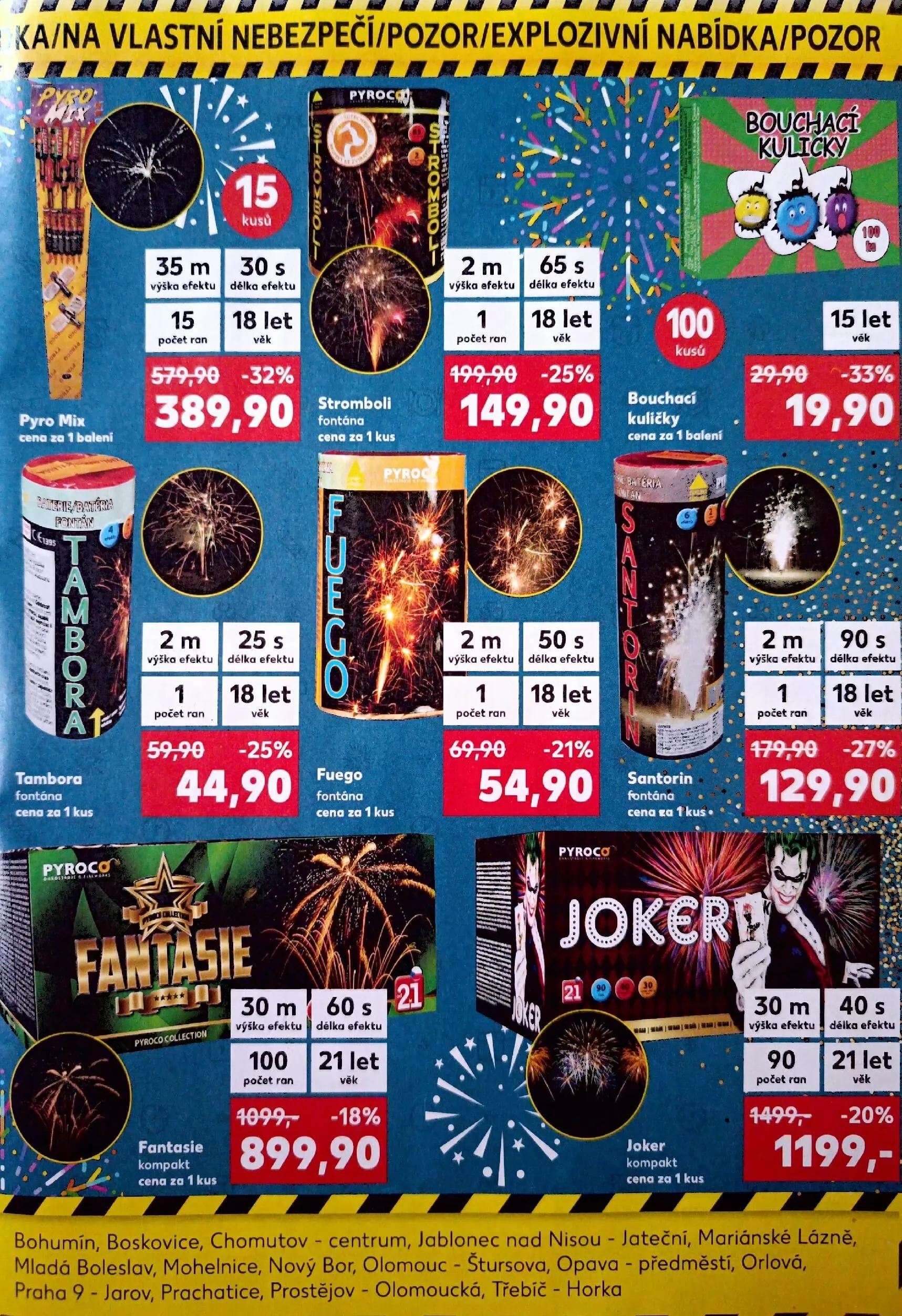 V letáku obchodu Kaufland najdete širokou nabídku pyrotechniky pro různé příležitosti. Mezi produkty se objevují fontány jako Tambora, Pyroc a Fuego, které nabízejí efekty až do výšky 35 m a délku trvání až 90 s. Všechny produkty jsou určeny pro osoby starší 18 let a jsou k dispozici za zvýhodněné ceny, například fontána Santorin za 44,90 Kč nebo kompaktní pyrotechnika Joker za 1 199 Kč. Nezapomeňte na bezpečnostní pokyny a užijte si oslavy s našimi kvalitními výrobky!