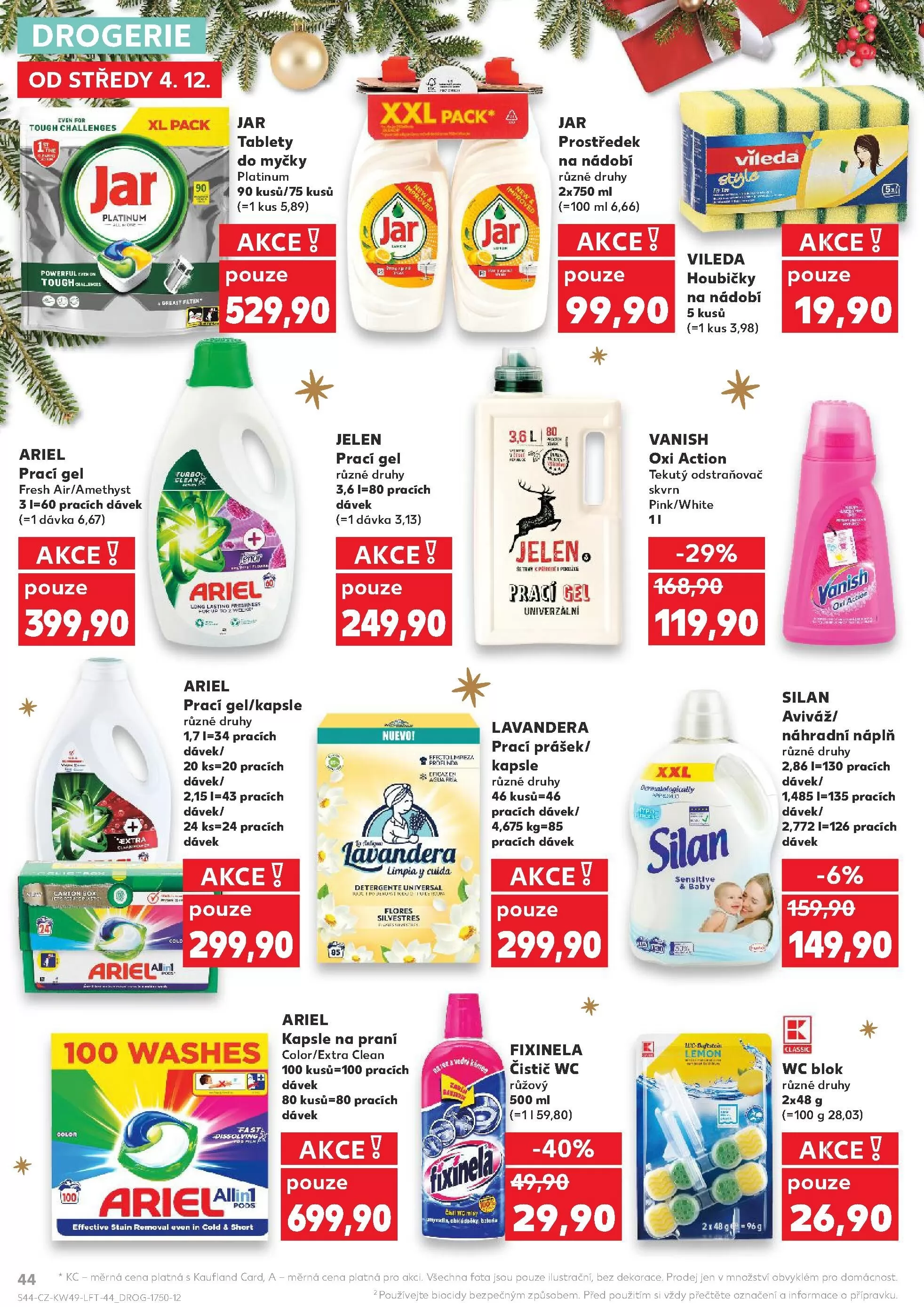 V letáku obchodu Kaufland najdete širokou nabídku produktů pro domácnost a osobní péči. Mezi hlavní akční položky patří prací gely a prášky značek Ariel a Jelen, které jsou k dispozici v různých variantách a baleních. Například Ariel prací gel s 60 dávkami je nyní za akční cenu 399,90 Kč.