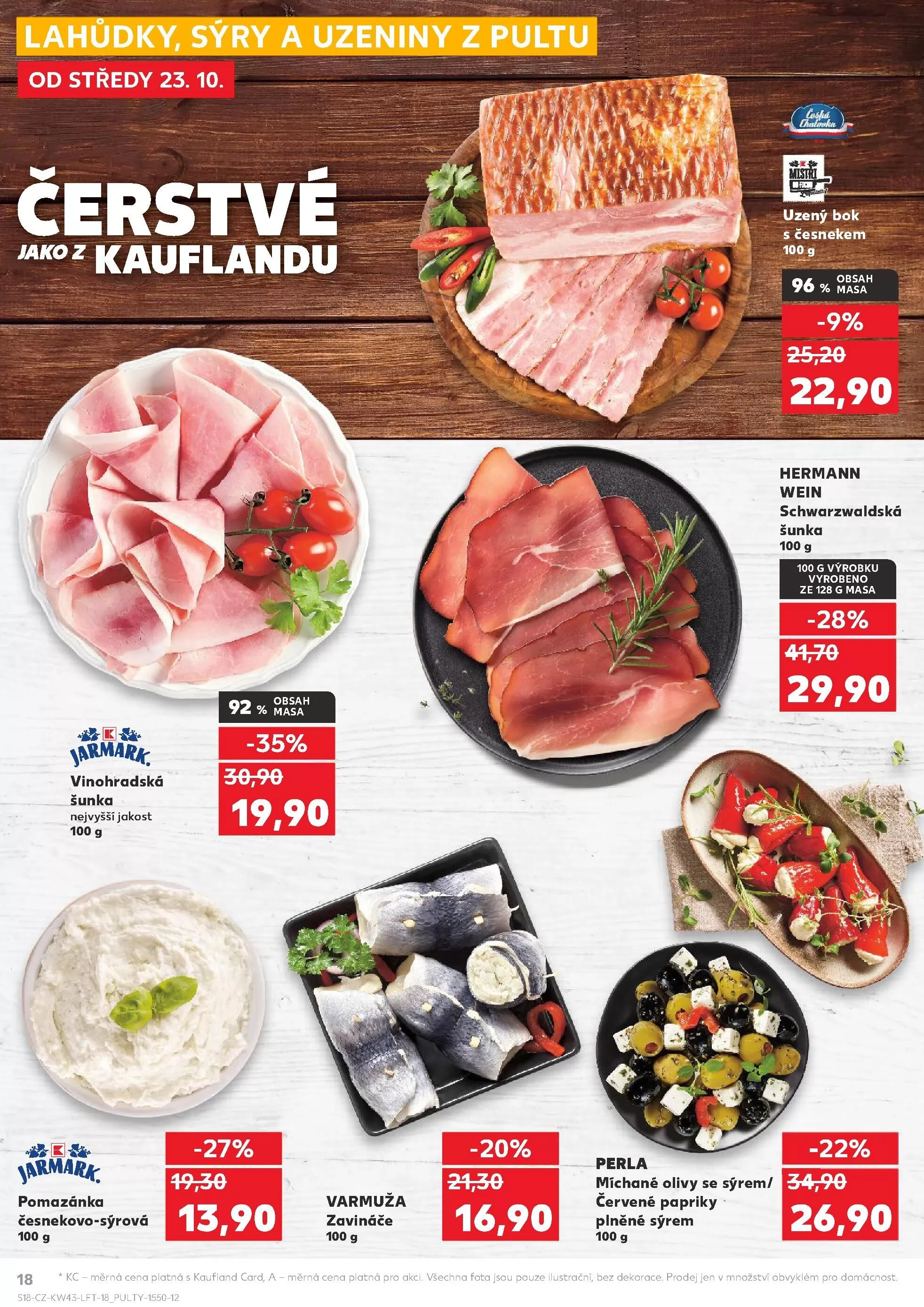 V letáku obchodu Kaufland, platném od středy 23. 10., najdete širokou nabídku lahůdek, sýrů a uzenin z pultu. Mezi čerstvými produkty se můžete těšit na vynikající česnekovo-sýrovou pomazánku za 13,90 Kč (100 g) a zavináče za 16,90 Kč (100 g). Nezapomeňte také na výbornou Schwarzwaldskou šunku, která obsahuje 96 % masa a je k dostání za 22,90 Kč (100 g). Pro milovníky oliv máme míchané olivy se sýrem a červenými paprikami, které si můžete pořídit za 29,90 Kč (100 g). Všechny ceny jsou platné s Kaufland Card a měrné ceny se vztahují na akční nabídku. Těšíme se na vaši návštěvu!